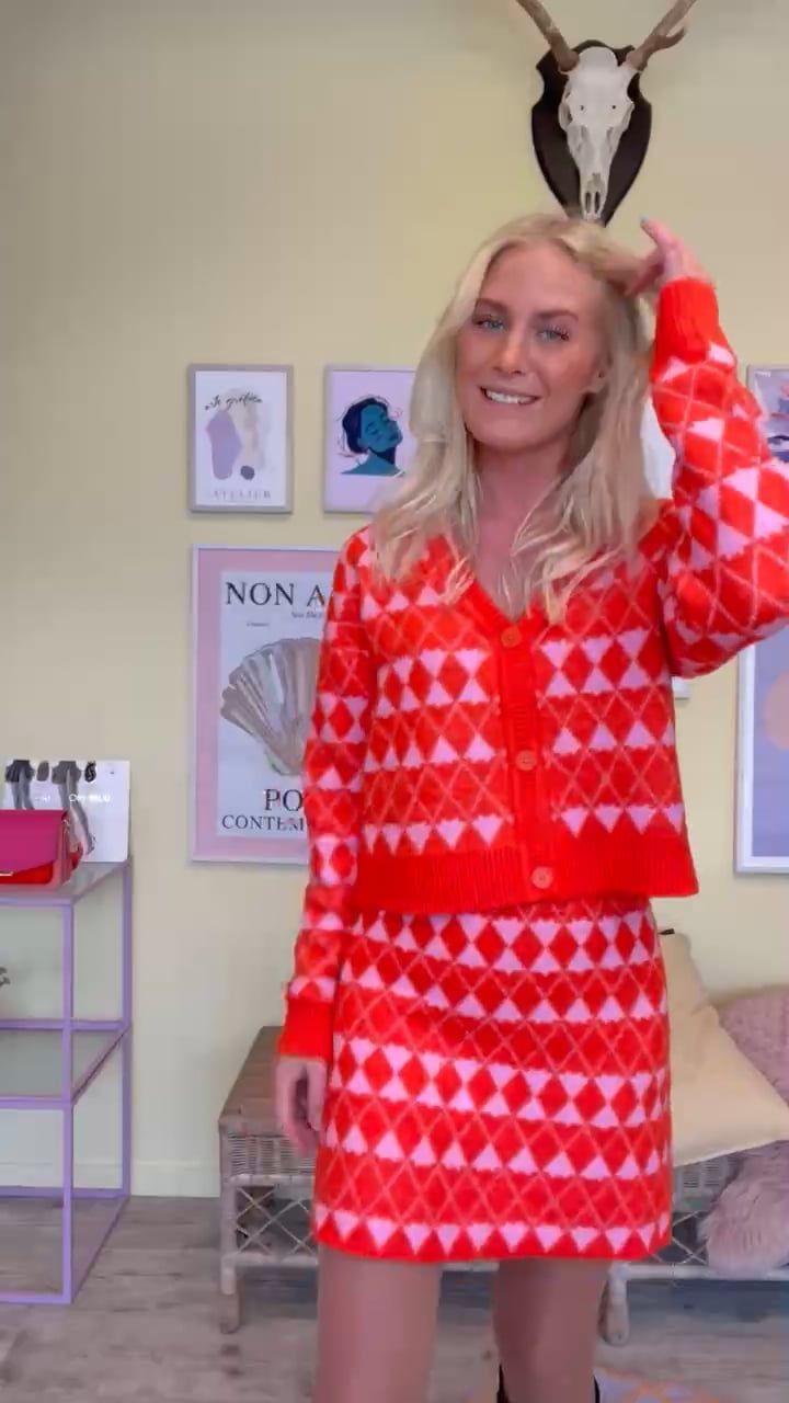 OH MY!! Det her sæt fra Pieces er så overdrevet cool og smukt på samme tid. Cardiganen er lavet i den blødeste hyggelige kvalitet i et retro mønster i rosa og orange nuancer. Den er en smule cropped med knapper foran og v-udskæring. Den er så sej at bruge med den matchende nederdel men kan samtidig styles til et par højtaljet jeans til efteråret.
