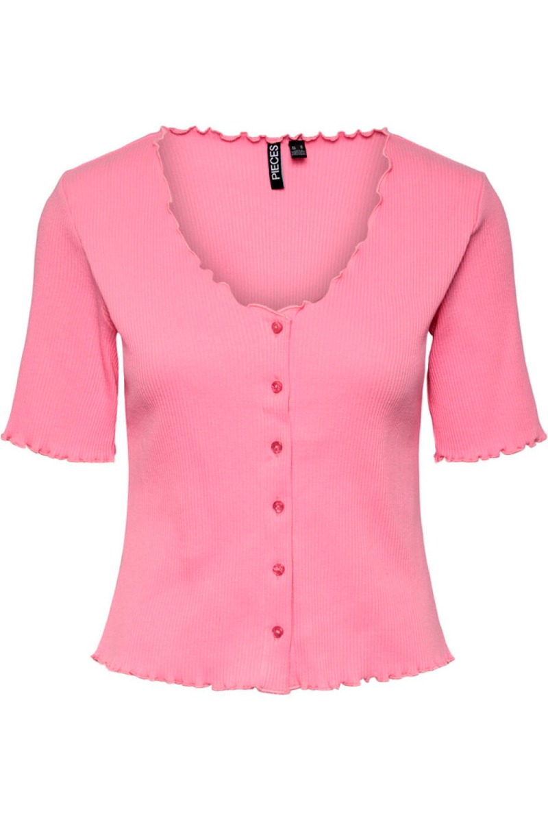 Super sød cardigan med t-shirt ærmer og knapper fra Pieces. Blusen er i en lækker blød ribkvalitet med en flæsekant ved både ærmer, i bunden og i halsudskæringen. En helt perfekt basis t-shirt at have i garderoben.