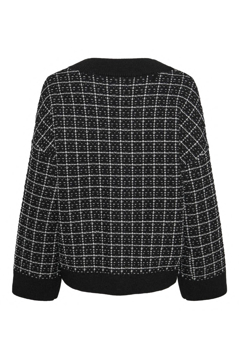 En super dejlig cardigan fra Pieces. Denne cardigan har knaplukning og to lommer. Den har et fint firkantet mønster i sort og hvid, med sølvtråd i de hvide striber. Den virkelig fin at bruge sammen med den matchende nederdel, for et fuldendt look.