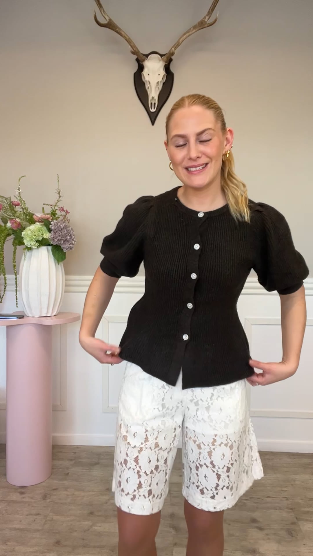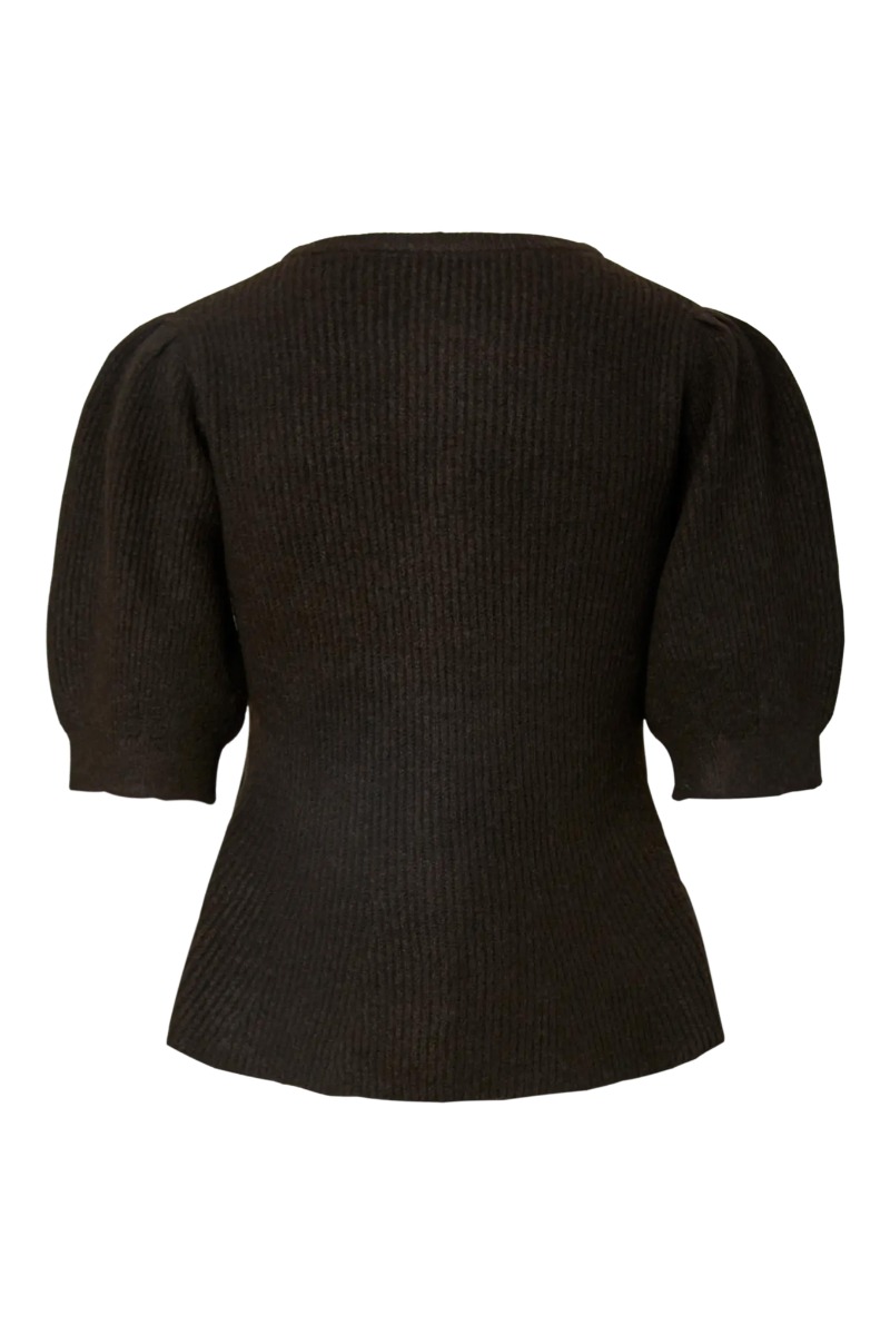 Denne cardigan fra Pieces er strikket i et blødt, ribbet materiale og har en klassisk, men feminin silhuet. Den er designet med korte, let puffede ærmer, som giver et elegant og romantisk udtryk. Cardiganen har en rund halsudskæring og lukkes foran med små knapper i matchende farve. Den mørkebrune nuance gør den alsidig og nem at kombinere med forskellige outfits – perfekt både til hverdag og mere pyntede anledninger. Pasformen er let figursyet, hvilket giver et smigrende fald og en behagelig pasform.