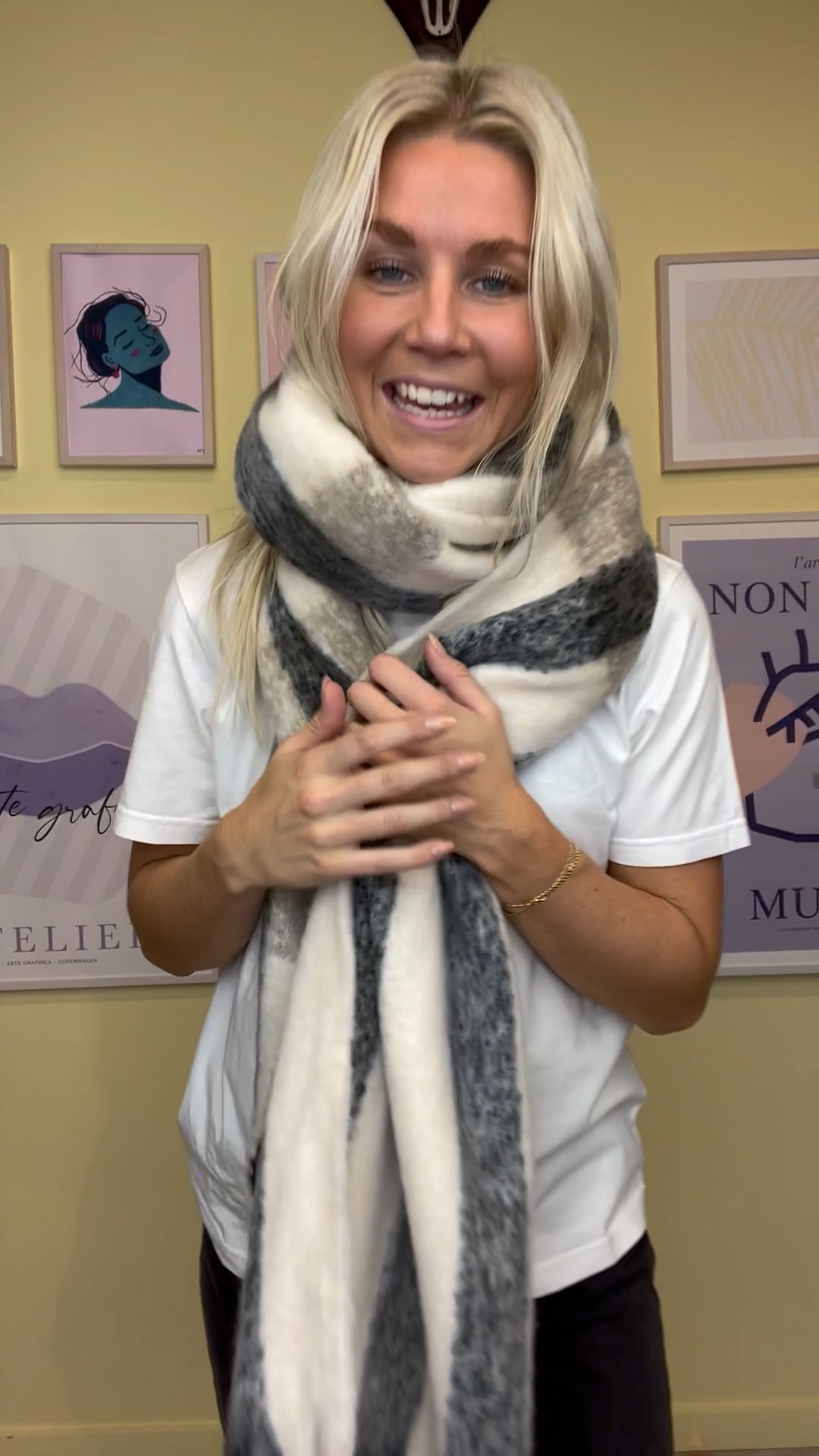 Et dejlig blødt og fyldigt halstørklæde fra Pieces er kommet til denne vinter. Det er ternet i rå hvid og grå striber, der så danner det ternet mønster. Forenden er der sat et frynser som giver den rigtig vinter stemning. Det passer fint sammen med en trenchcoat og kan også sagtens bruges sammen med den vinter jakke.