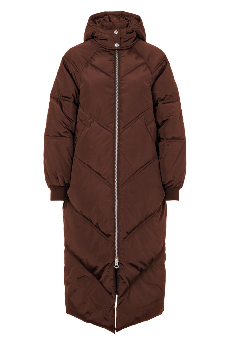 Den flotteste nye jakke fra Pieces i brunlig nuance. En rigtig pufjakke med god længde, som holder dig varm igennem hele vinteren. Der er skrå syningsdetaljer i jakken, som giver et super smukt spil i jakkens look. Jakken er med hætte og har også rib-kanter i ærmerne, som gør at kulden har sværere ved at komme ind. Der lukkes med synlig lynlås i sølv samt to sølvknapper i toppen ved halsen.
