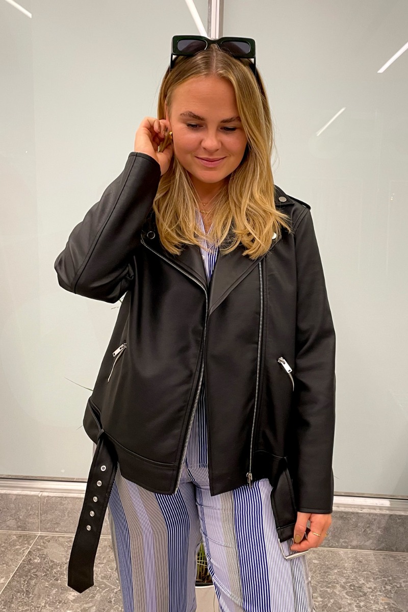 JAAA TAK!! Nu kan du sikre dig denne seje bikerjakke fra Pieces. Jakken har alle de klassiske detaljer vi kender fra bikerjakkerne så som det brede bælte i bunden af jakken, den store V-krave og selvfølgelig de sølvfarvede lynlåse.