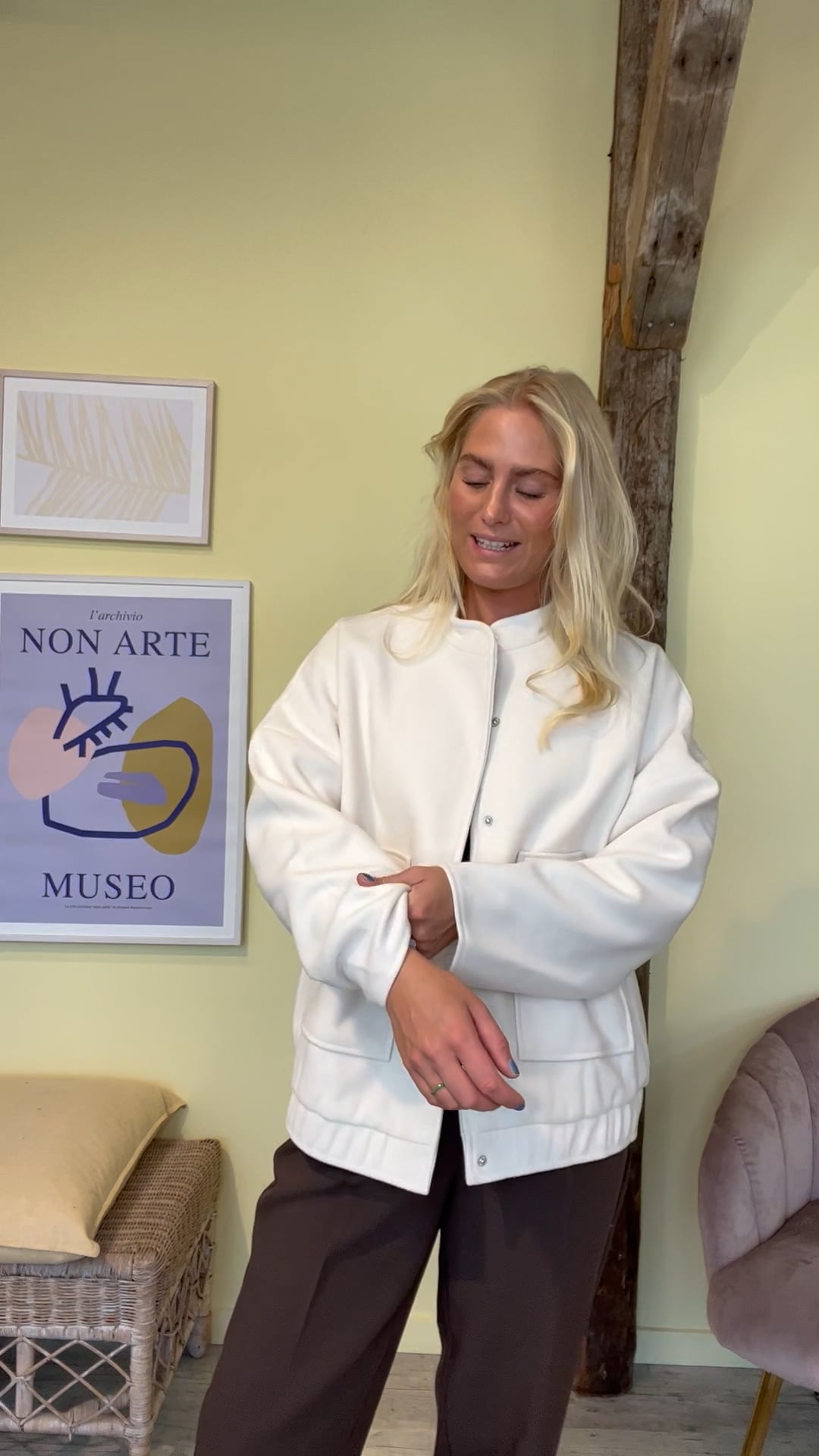 En bomber jakke model i hvid i den blødeste kvalitet fra Pieces. Jakken lukkes foran med trykkanpper og har dybe lommer. Derudover er pasform løs og derfor er ærmerne også løse. I bunden er der sat en elastikkant som giver et cool udtryk. Den findes også i grå.