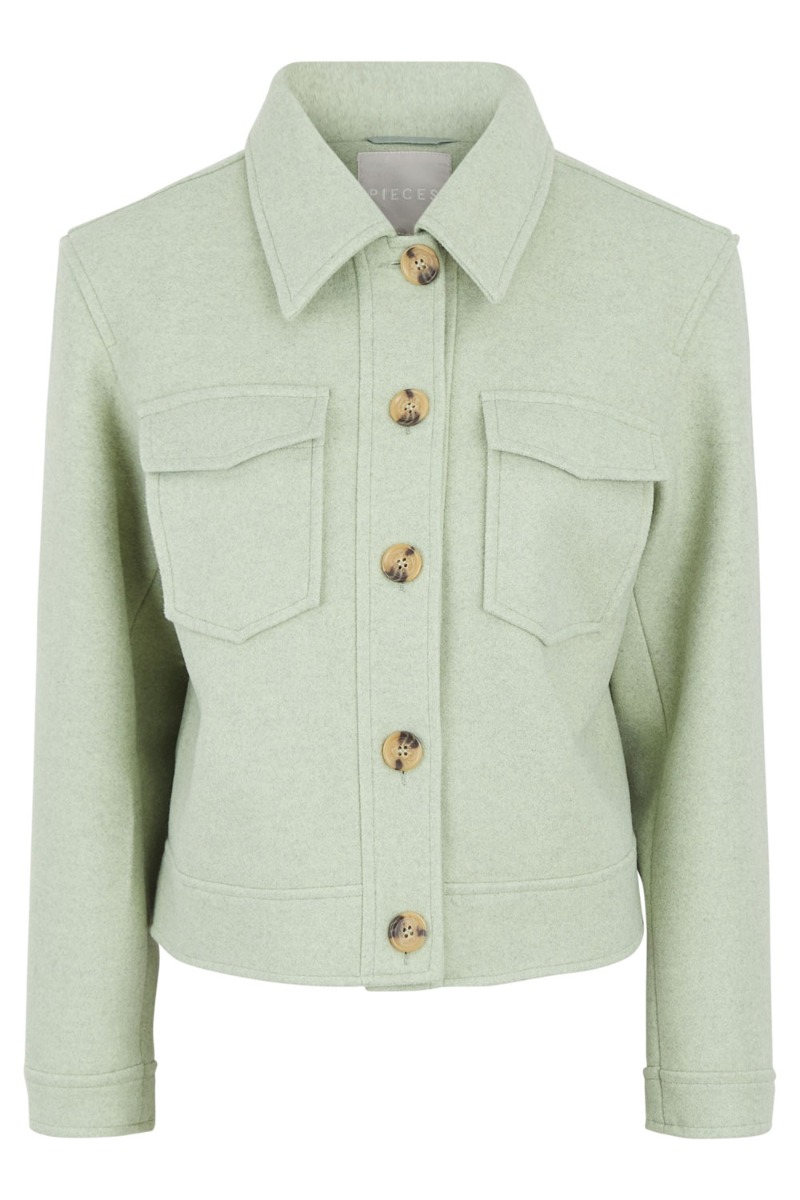 Skøn jakke fra Pieces i et kraftigt materiale med knapper foran. Jakken er en anelse kortere end normal, hvilket gør den oplagt over dine lange kjoler og de højtaljet jeans. Den har et helt simpelt look i den fineste støvet grønne nuance og super nem at style over alle de fine forårsnyheder.