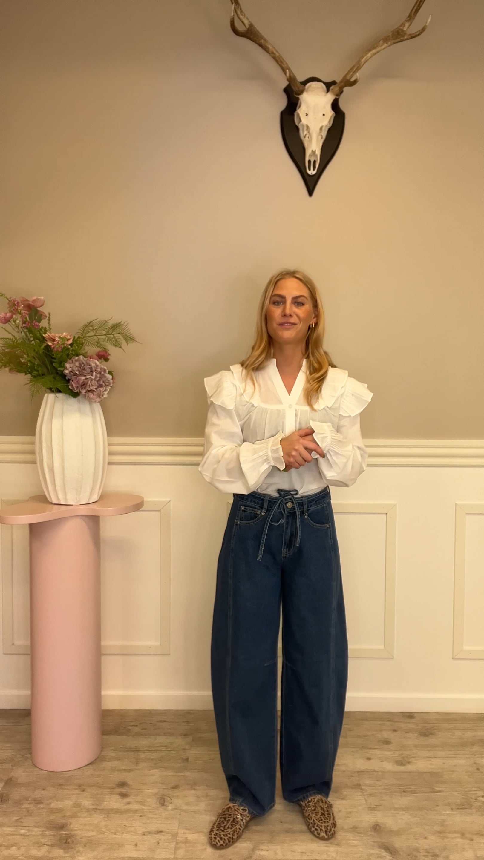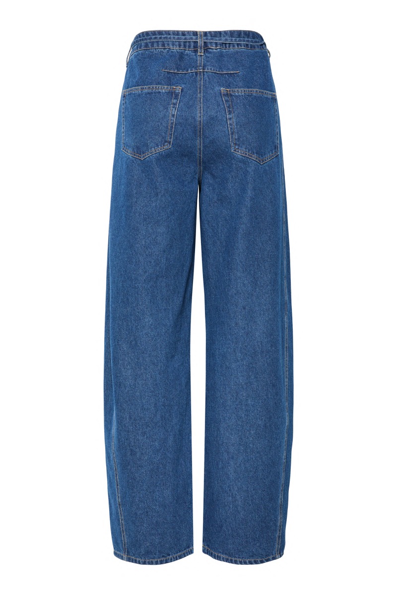 Jeans fra Pieces. Disse jeans har et oversized look med buede, voluminøse ben som sidder løst omrking hofter og lår. De bliver smallere forneden ved anklen. Normale detaljer som lynlåslukning og sidelommer, bindebånd som detalje.