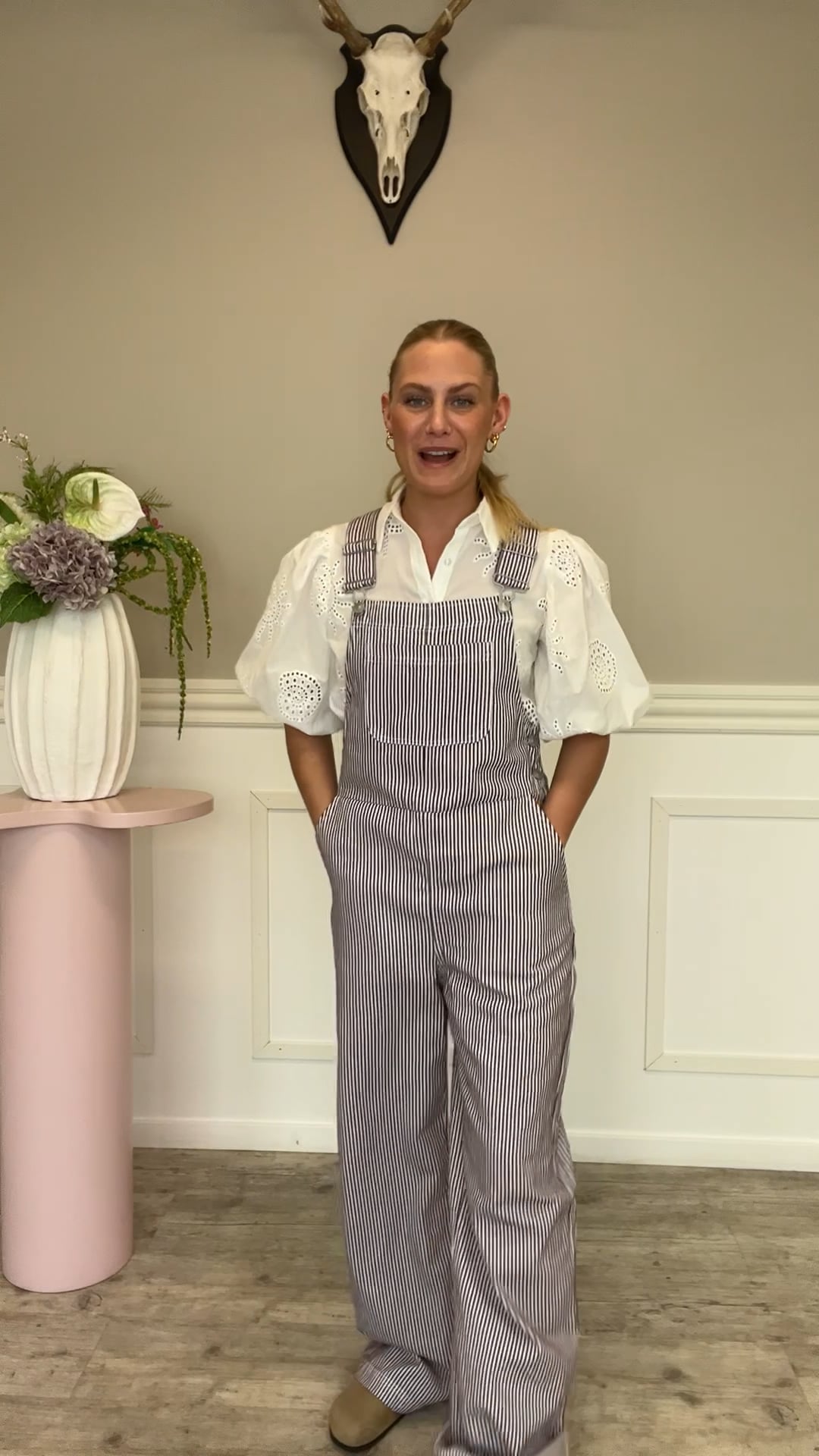 Cool og afslappet overall i et fintstribet design, der giver et moderne og casual udtryk. Modellen har brede stropper med justerbare spænder, klassisk brystlomme samt sidelommer, der understreger det funktionelle look. De lange, lige ben skaber en flatterende silhuet og gør den behagelig at have på hele dagen.