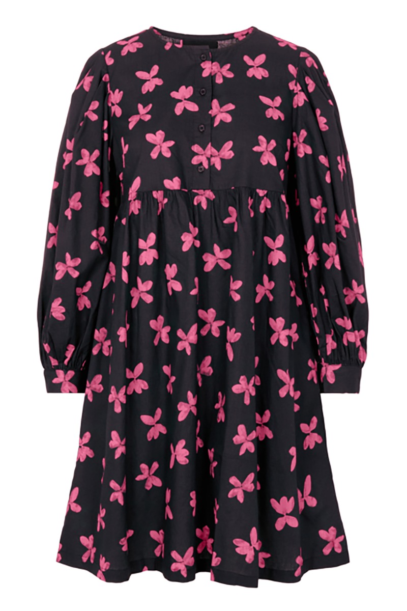 Wauw denne kjole skal simpelthen ses på! Kjolen er fra Pieces og har fineste pasform med ballonærmerne og et snit der giver talje og en flot figur. Kjolen har en fint pink printog knappes med små sorte knapper til ned under brystet.
