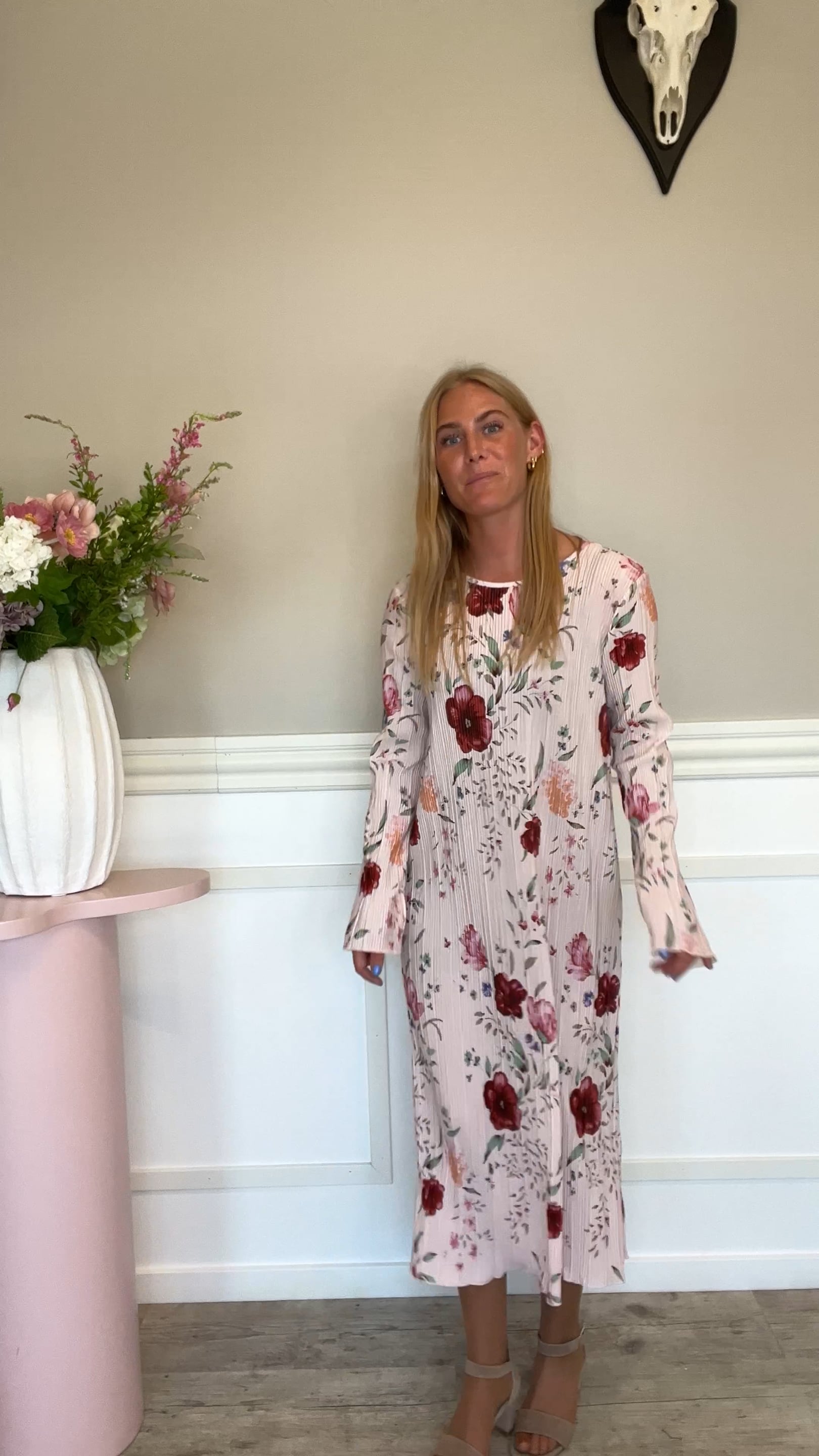 Sødeste kjole fra Pieces. Denne kjole har et virkelig fint print med blomster. Kjolen har en rosafarvet baggrundsfarve, som vi elsker! Den har lange ærmer og falder super pænt. Brug den til forårets/sommeres fester og særlige anledninger.
