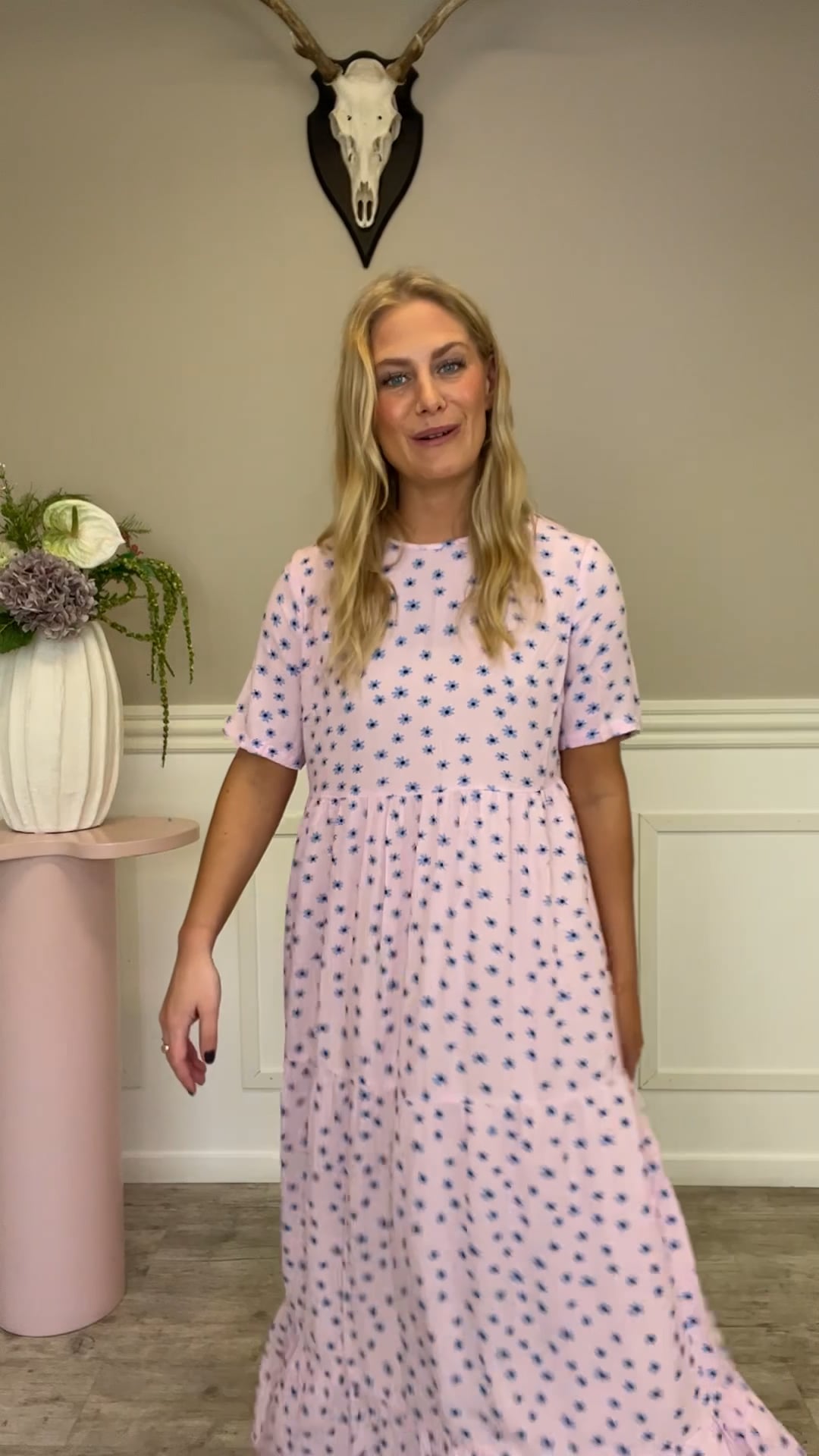 En fin kjole fra Pieces i et smukt rosa print er landet. Den er med løs pasform og derfor også perfekt til de varmere dage. Den er lavet i en let kvalitet og findes også i gul. Passer fint til de fleste kropstyper.