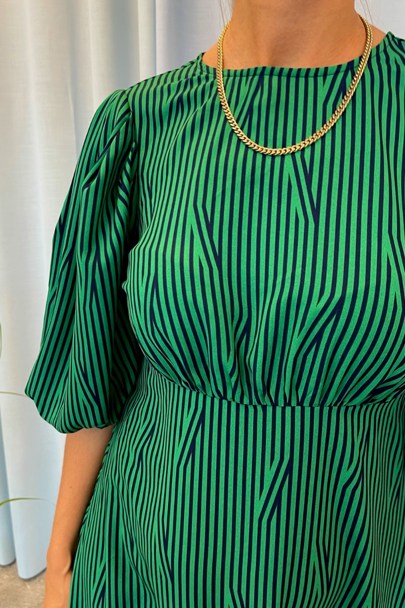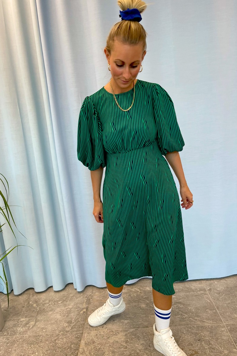 Den skønneste kjole fra Pieces kan nu blive din! Kjolen har så mange fine detaljer så som det gennemgående grafiske print med striber hvor striberne overlapper enkelte steder. Simpelthen så smuk! Kjolen har desuden korte pufærmer med elastik i ærme-afslutningerne. Der er rund halsudskæring og syning i taljen, der giver en smuk detalje til kjolen.
