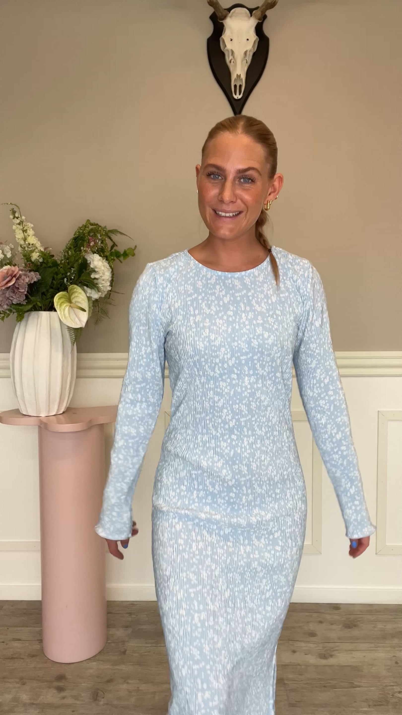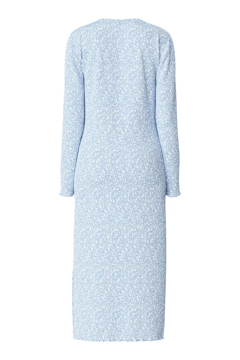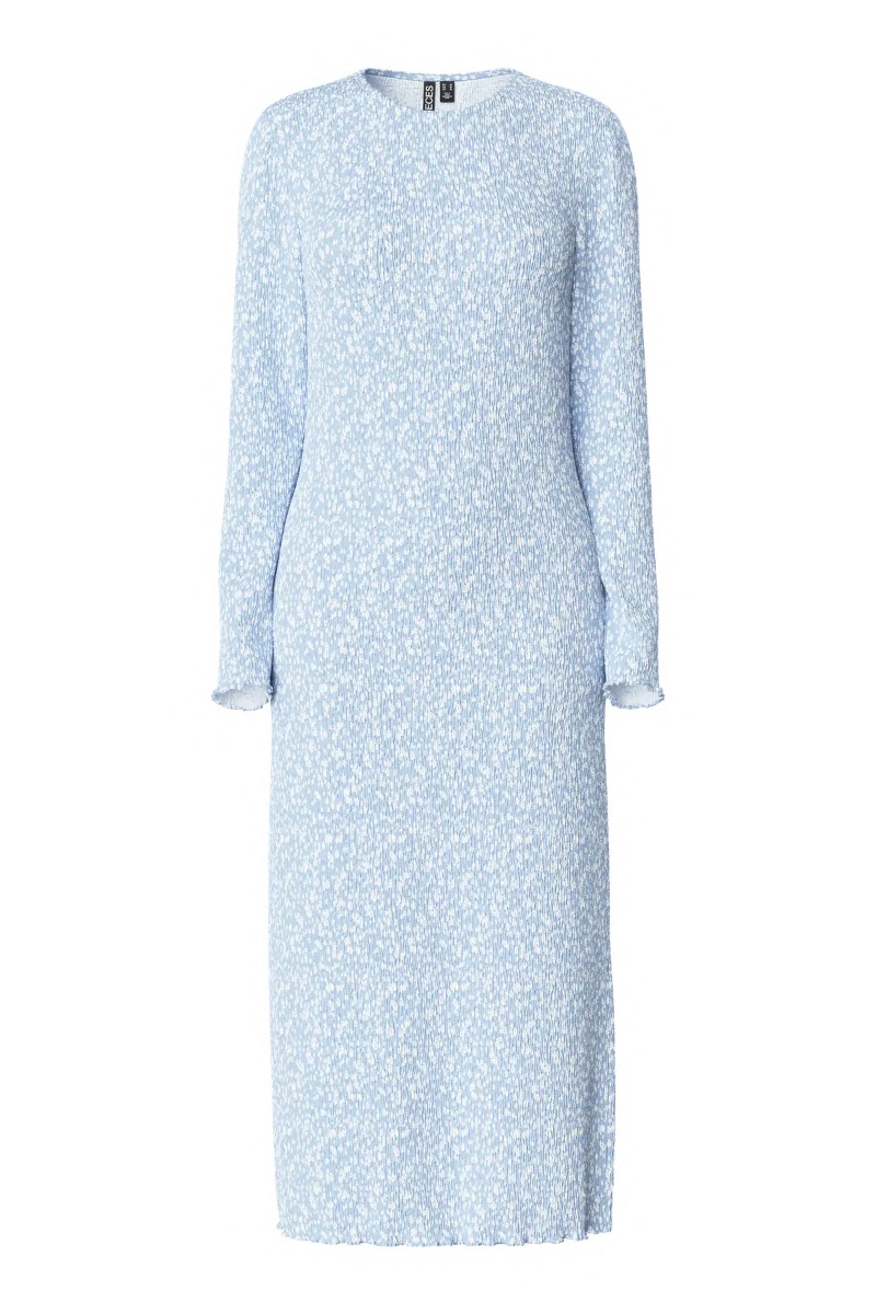 En perfekt kjole fra Pieces i lyseblå nuancer. Den er god som graviditetskjole da den er i et strækbart plisseret materiale. Den er let i kvaliteten og strammer ikke selvom den er tætsiddende. Den er med lange ærmer og har den bølge kant både ved hals, ærmer og bund. Den findes i flere farver.