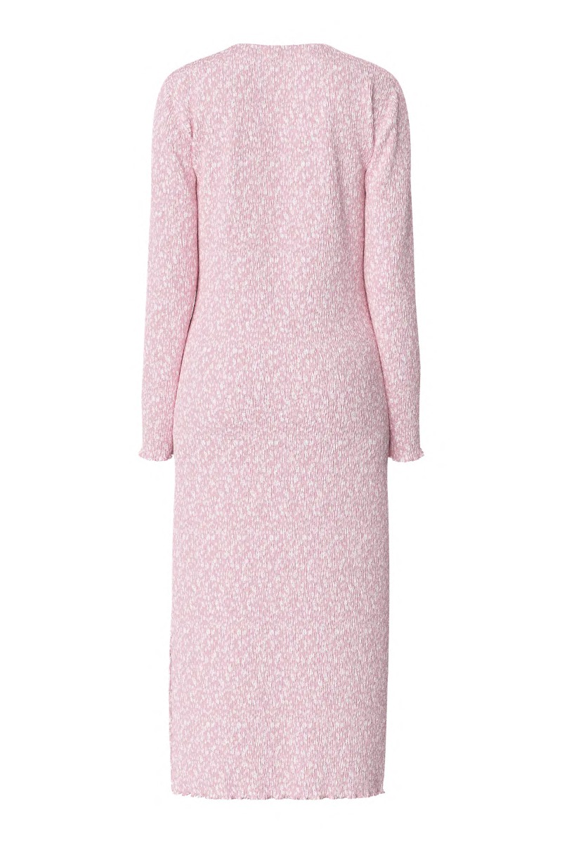 En sød kjole fra Pieces i lyserøde nuancer. Den er god som graviditetskjole da den er i et strækbart plisseret materiale. Den er let i kvaliteten og strammer ikke selvom den er tætsiddende. Den er med lange ærmer og har den bølge kant både ved hals, ærmer og bund. Den findes i flere farver.