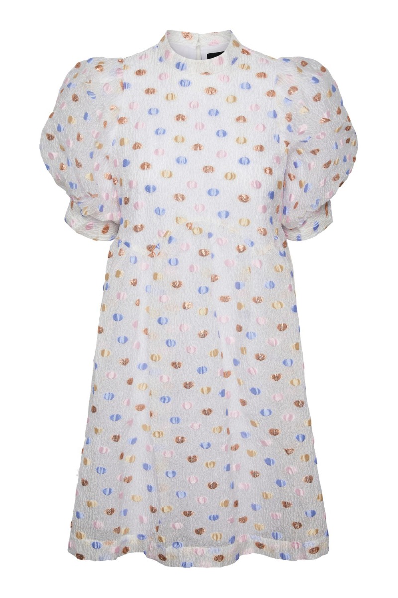 Wauuuw wauw wauw se lige den smukkeste kjole fra Pieces. En smuk hvid kjole med små blå, guld, lyserøde og bronze prikker på, SÅ SMUK!