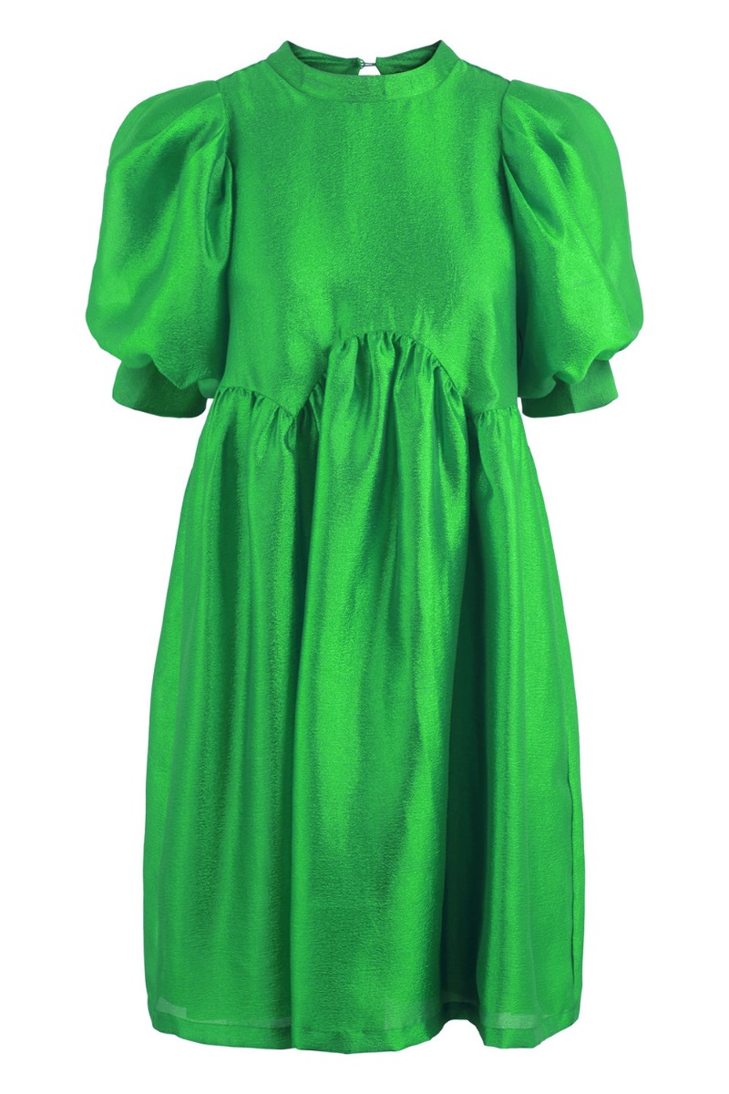 Den smukkeste grønne shiny kjole kan nu forudbestilles til November. Ingen tvivl om at der er rift om disse kjoler og de har da også den flotteste shape. Her kan du få den fineste kjole til vinterens fester og samtidig være flot farverig til Spring 2022. Kjolen falder flot og har puf-ærmer, samt en flot krave der lukkes i nakken med en knap.
