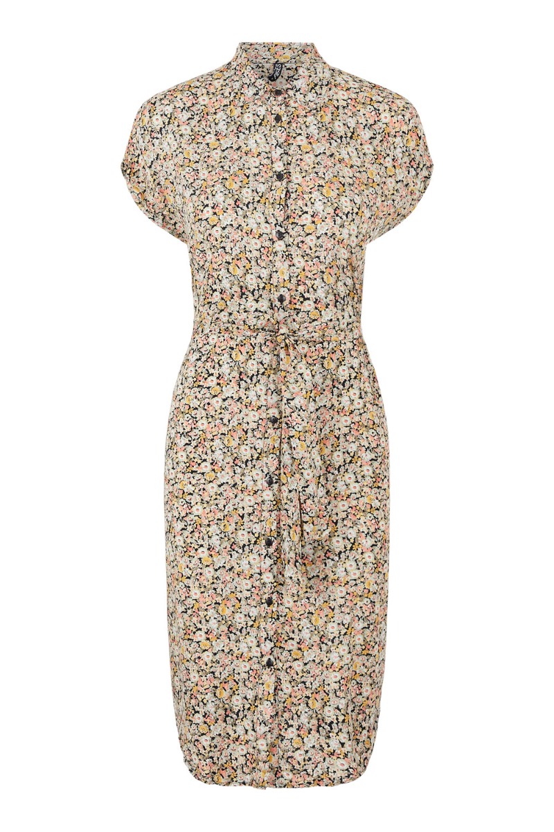 Mellem lang kjole fra Pieces med bindebånd i livet og knapper hele vejen ned, der gør den ammevenlig. Kjolen er løst siddende med skjortekrave og kan sagtens bruges med en lille babybule. Bundfarven er sort med det fineste lilla og blå blomsterprint. Style den med en sandal eller sneaks.