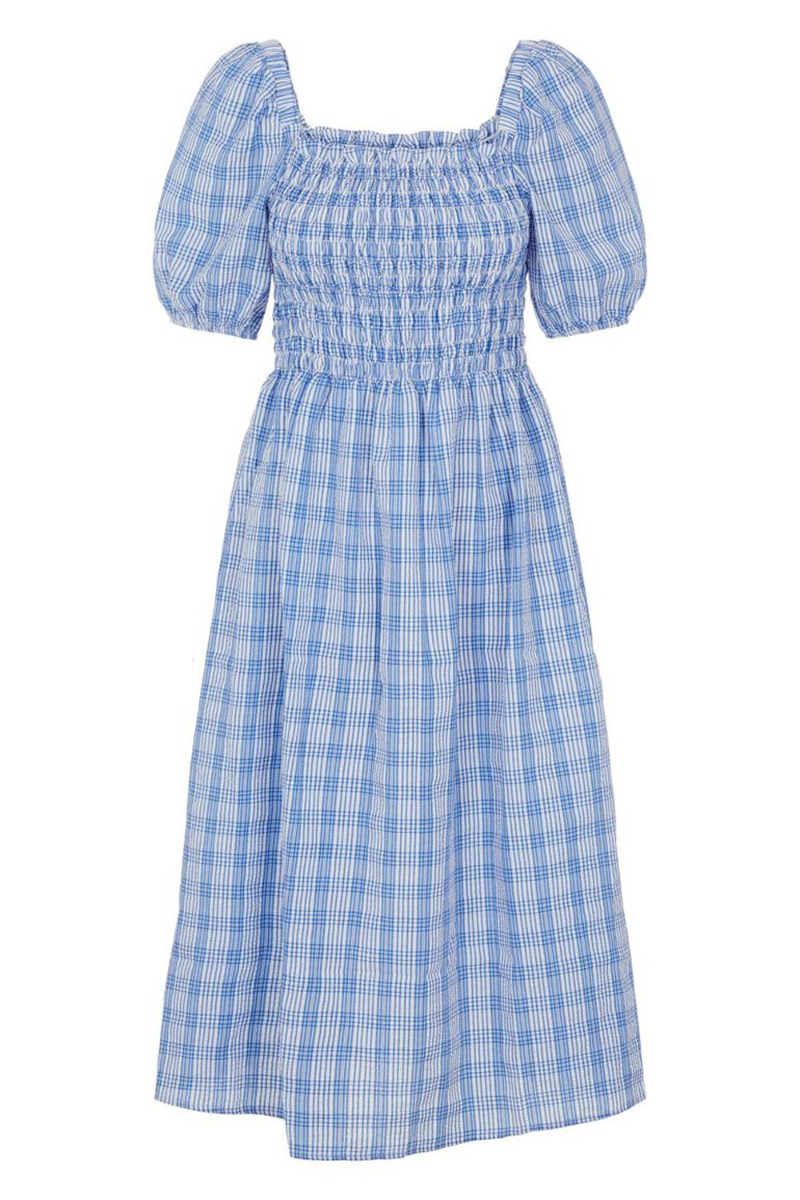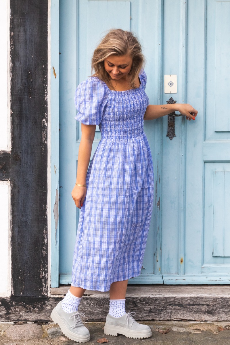 Sød blåternet kjole med smock ved barmen og firkantet udskæring der fortsætter bagpå. Kjolen er løs efter taljen og perfekt til de solrige sommerdage. Den er lavet i et skønt crepe materiale med små ballonærmer. Style den med en sød sandal eller sneaks for at skabe et mere afslappet hverdagslook.