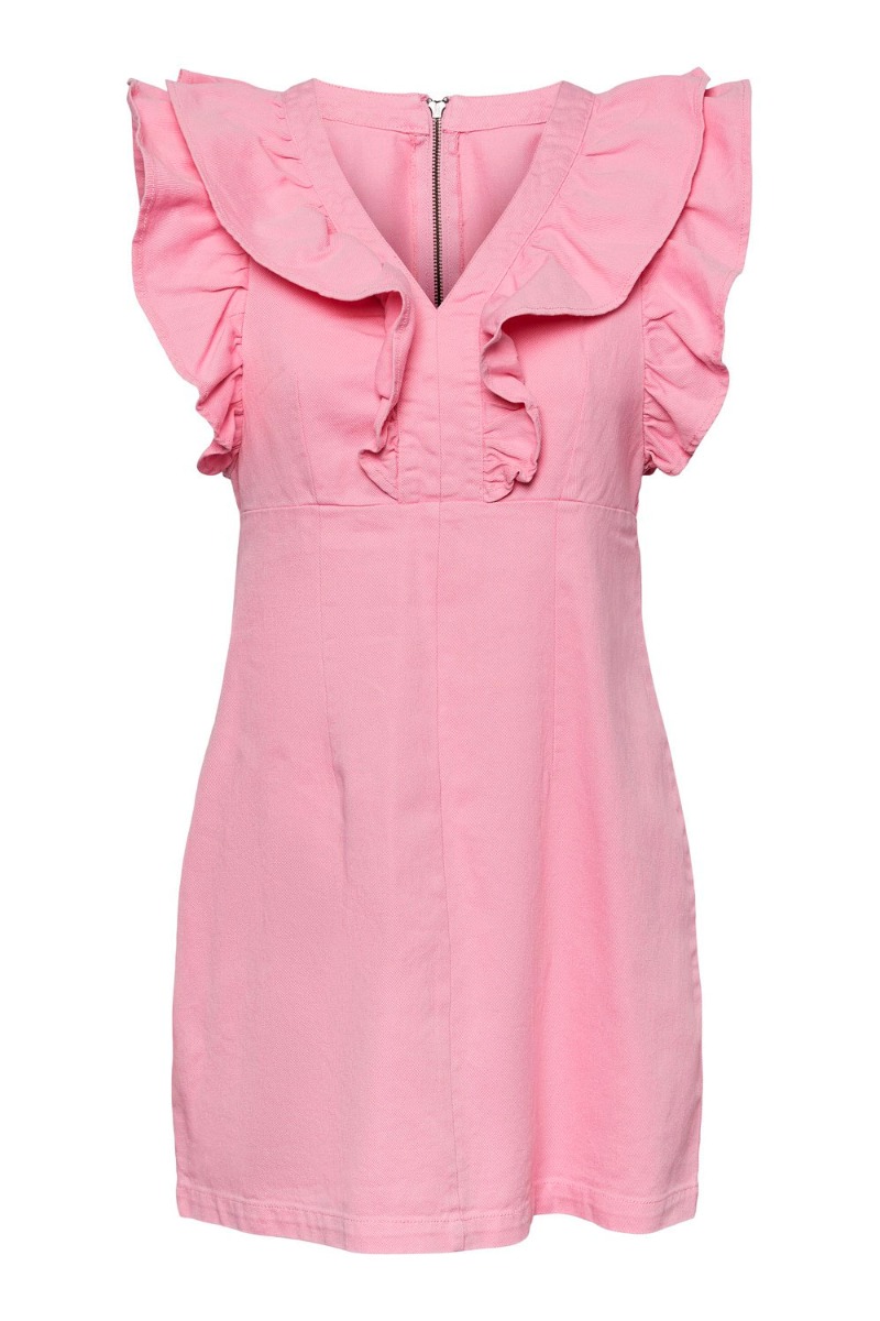Skøn pink denimkjole fra Pieces. En feminim kjole med v-udskæring og korte ærmer. Den er pyntet med de fineste flæsedetaljer som giver et råt og cool udtryk. Kjolen har en tætsiddende pasform med lynlås i ryggen. En skøn kjole som du kan style helt som den er eller med en sød skjorte under.