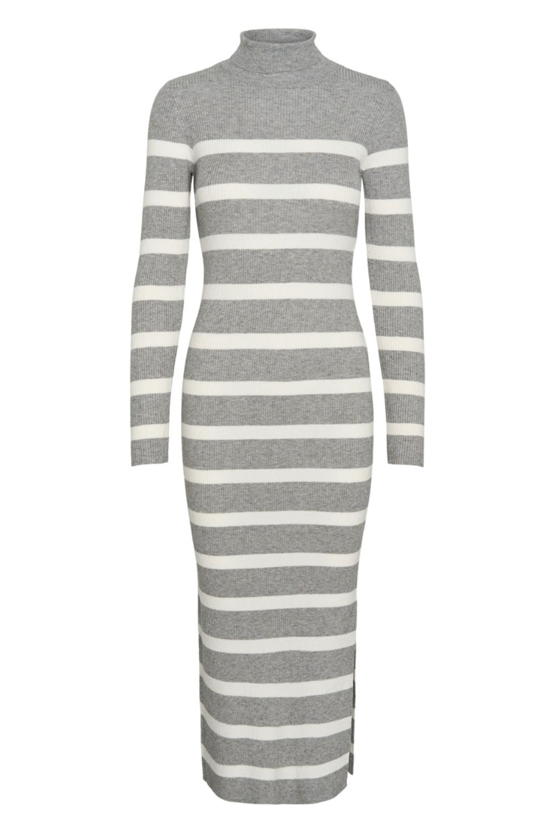 Den fineste strikkjole fra Pieces med grå og hvide striber. Kjolen er i en lettere strikkvalitet og er med rullekrave. Den er tætsiddende og ville være perfekt til en babybule!