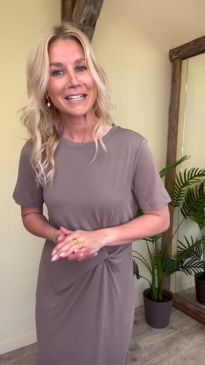 Super blød og lækker kjole fra Pieces! Kjolen er lang og med en lille knudedetalje, hvilket gør at kjolen sidder så flot. Den er i det blødeste materiale og findes også i en klassisk sort. Der er slidsdetalje forneden og er helt normal i størrelsen.