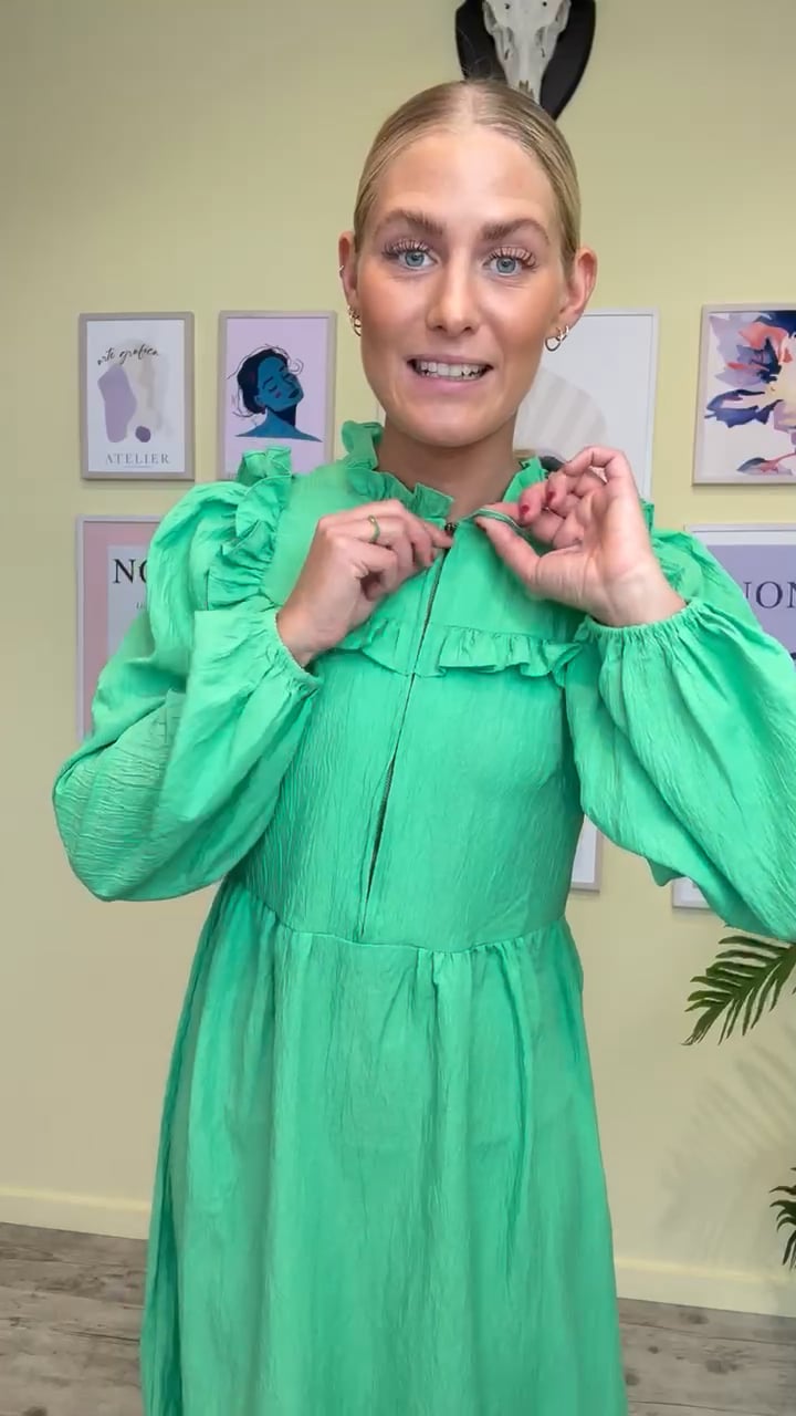 En rigtig sød kjole fra Pieces i den flotteste grønne nuance. Kjolen er rummeli med flæsedetaljer og en lang zip lynlås foran. Den er lavet i et crepet materiale der heller ikke krøller særlig meget - hvilket vi virkelig elsker her hos Lykke by Lykke.