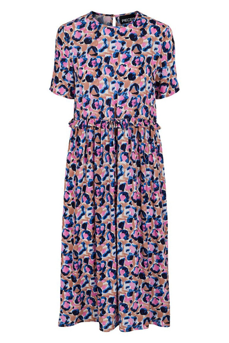 Sød Pieces kjole med et grafisk print i lyserøde blå og brune nuancer. Den er rummelig med en sød lille flæsedetalje ved livet der kan snøres ind og give en feminin pasform. Kjolen lukkes i nakken med sort knap der giver en lille dråbeformet åbning.