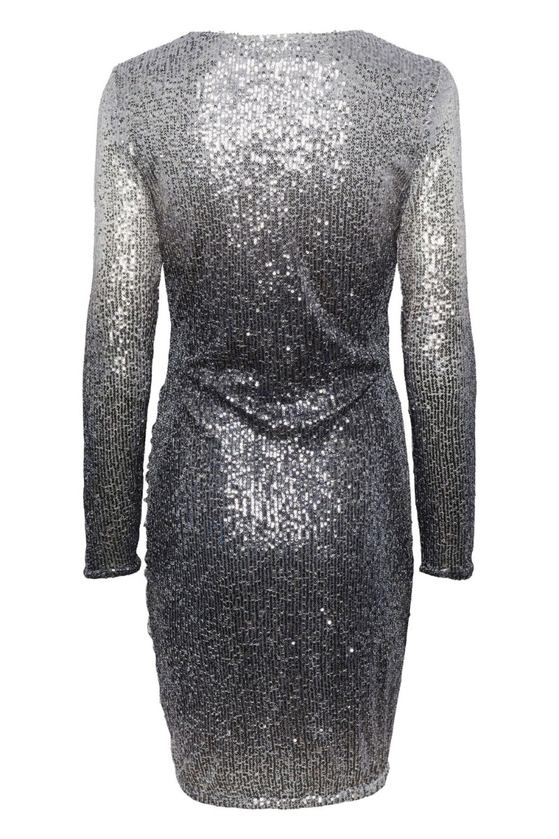 Den smukkeste kjole fra Pieces er landet til denne sæson. Den er med pailetter og fader i farven fra lys grå til mørk grå. Den er har slå-om effekt, som dog er fastyet så den ikke kan åbnes. Der er elastik i taljen og en smule drapering i den ene side. Den er derudover foret så den ikke kradser eller gennemsigtig.