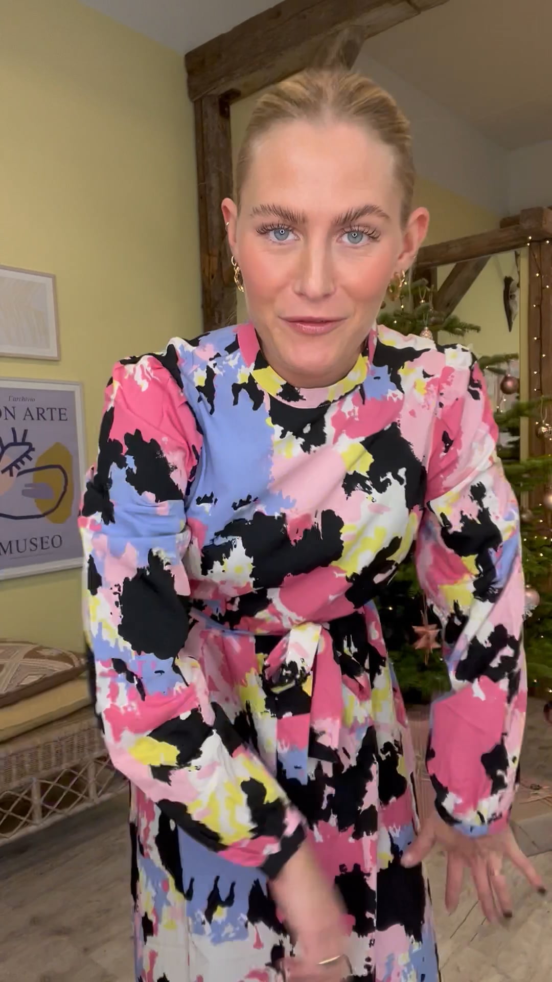 En fin kjole i et smukt print fra Pieces. Kjolen er løs i pasformen og har lange løse ærmer med en smule balloneffekt. Derudover er der elastik i taljen og der er sat et bindebånd som sagtens kan tages af hvis man hellere vil bruge kjolen uden. Den lukkes i nakken med en simpel knap og kan også bruges med en strik over det hverdag.