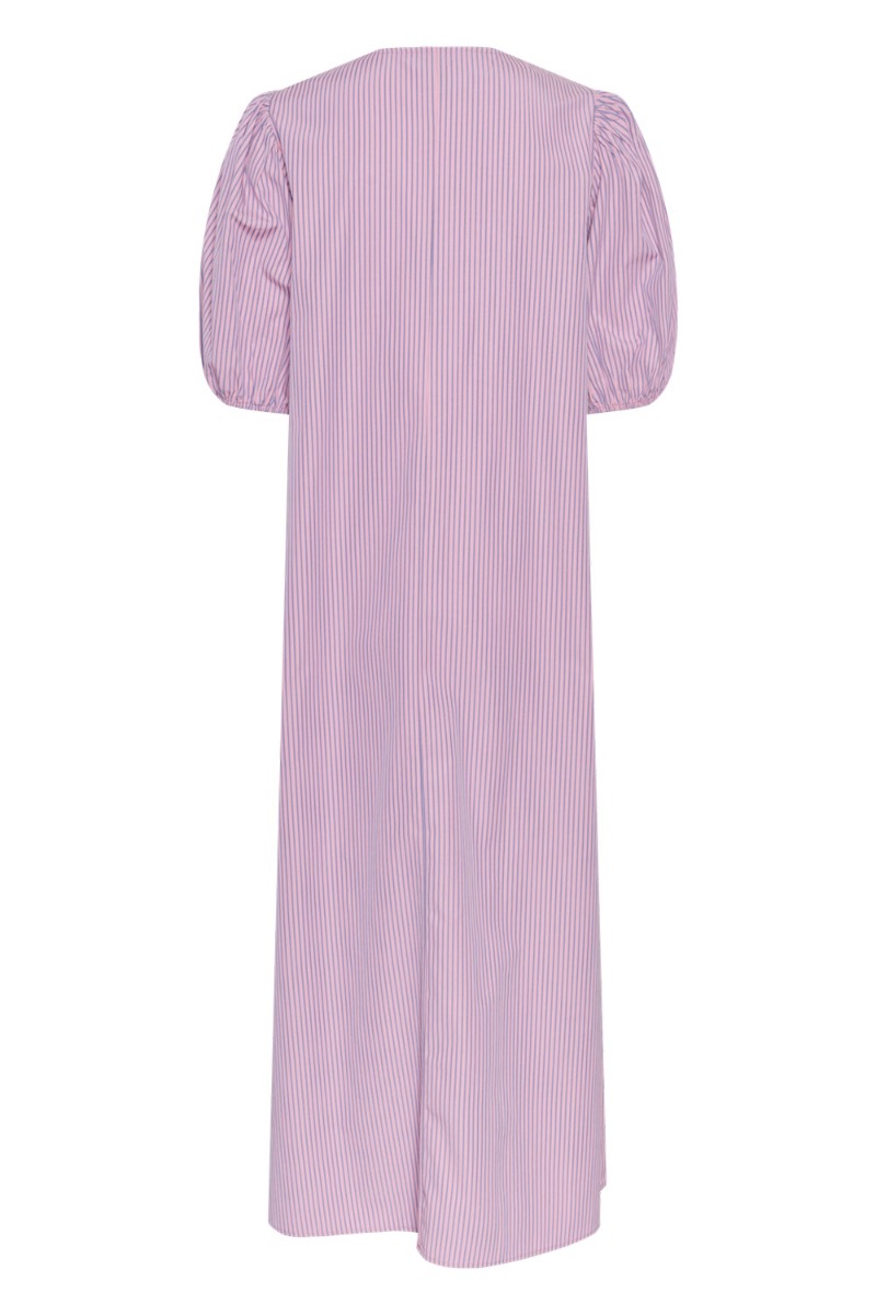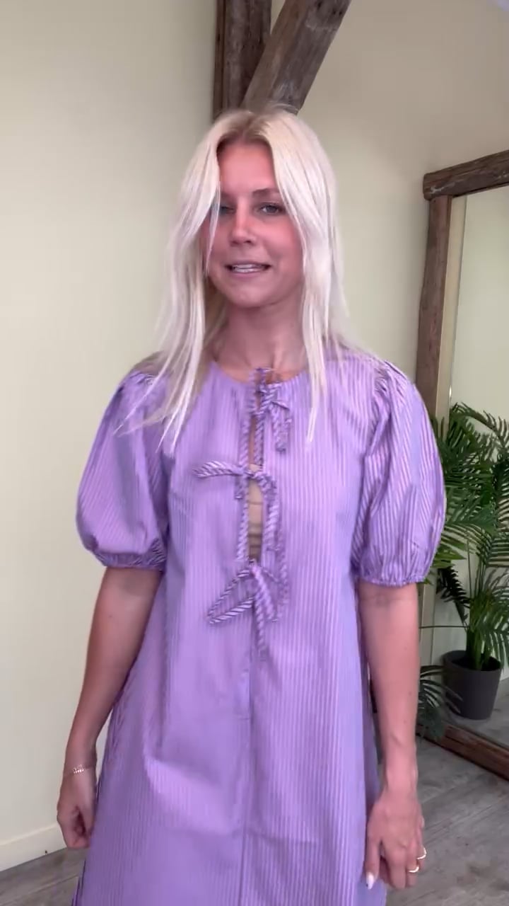 Den smukkeste og sødeste kjole fra Pieces med striber i rosa og blå. Kjolen er med A snit og har korte pufærmer. Derudover har den fine sløjfe detaljer foran. Der er lavet tre sløjfer som bindes med en tyndt bund. Vi anbefaler af bruge en top eller underkjole under, da den er dyb foran. En let sommer sag!