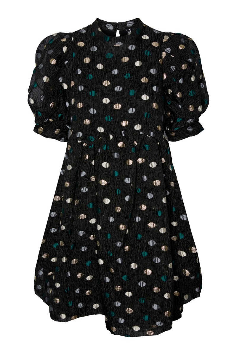 En nem kjole model der passer til mange fra Pieces i sort med prikker i forskellige farver. Kjolen er med pufærmer og en bølget udskæring under brystet. Der er en underkjole så yderstoffet kan få mere puf effekt uden der føles for løst.