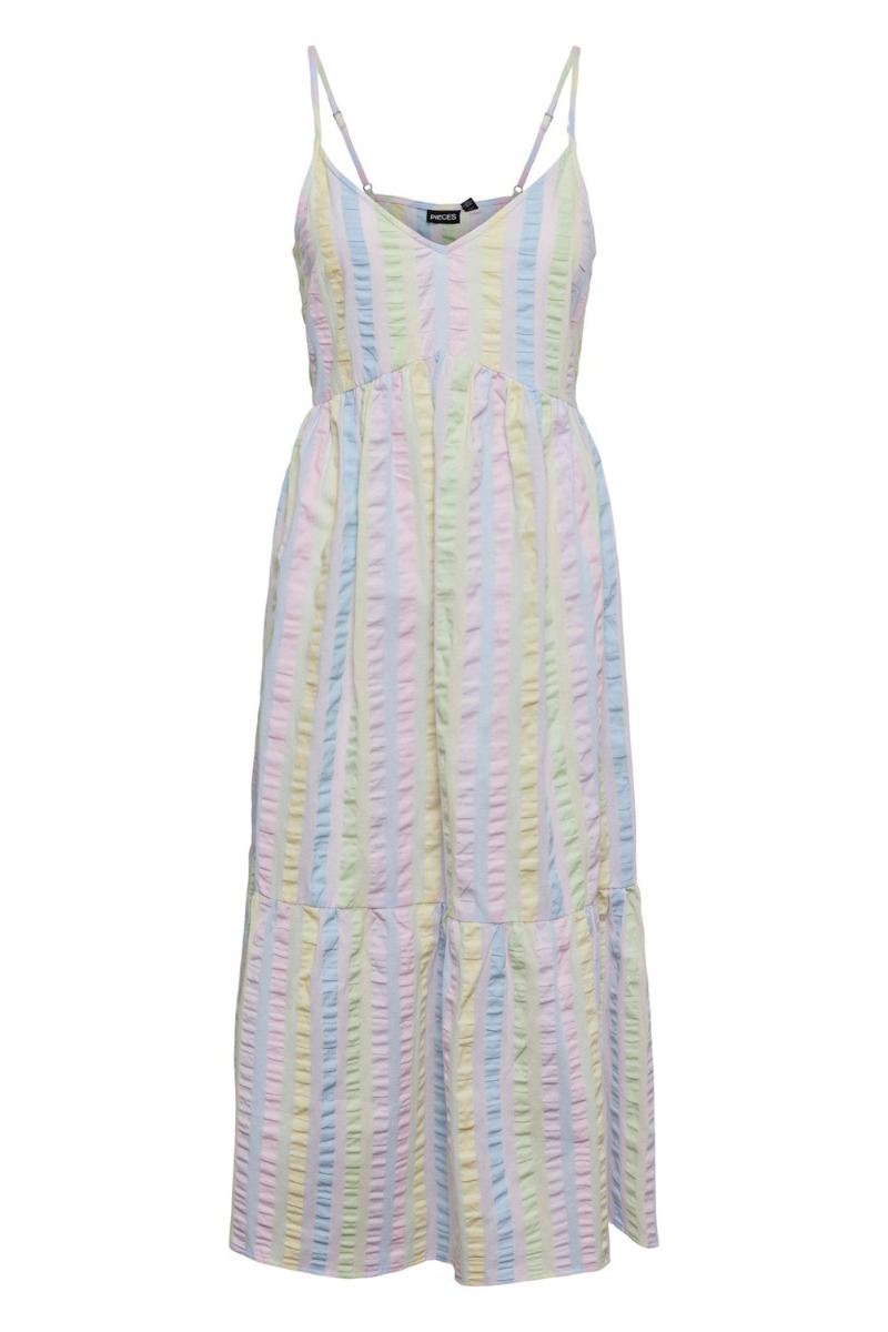 En rigtig LYKKE kjole fra Pieces i de skønneste pastel farver med stribet mønster. Kjolen er i et løst snit med tynde justerbare stropper og en lille v-udskæring foran. Den har peplum i bunden og er super sød med en lille slippers til de varme dage.