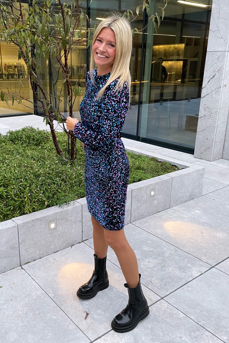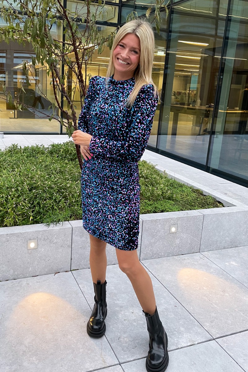 NU ER NYTÅRSKJOLEN LANDET! Kjolen er lavet i en tætsiddende model i et stretchy materiale med puffet skuldre. Den er designet med velour og de smukkeste farvet pailetter i blå og lilla nuancer. Du vil shine på dansegulvet i denne smukke kjole.