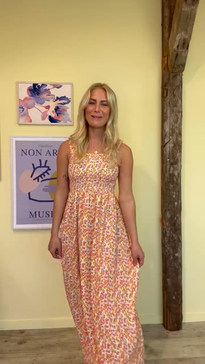 Vi kan slet ikke vente med at hoppe i denne fine sommerkjole fra Pieces til de varme solrige dage. Kjolen har smock ved barmen og de brede tropper der sidder behageligt og flot til med stretch. Den er løs nedefter og falder flot i et let materiale. Bundfarven er hvid med det flotteste blomsterprint i pink og orange farver.