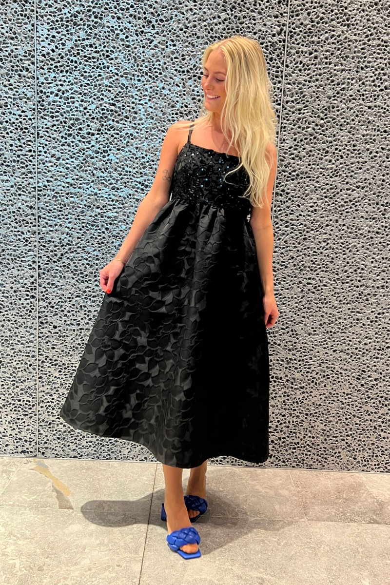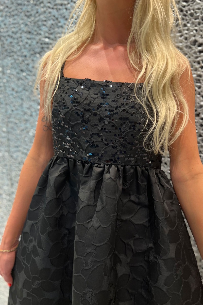 SÅ SMUK og feminim festkjole fra Pieces. En enkel sort sag pyntet med de smukkeste detaljer! Den har en sort bundfarve med broderet blomster overalt på kjolen. Under brystet har kjolen en tydelig syning som giver en todelt effekt. På brystet er den pyntet med små palietter som giver en fin glimmereffekt. På ryggen bliver kjolen bundet med små snøredetaljer som giver et utrolig smukt udtryk på kjolen! En kjole som fortjener en stilet og en festlig anledning!