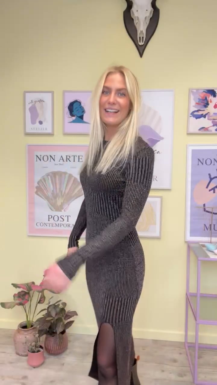 Super sød og sej glitterkjole fra Pieces. En kjole i et utrolig strækbart materiale med en flot guld glimmertråd. Den har en slids i siden som giver en feminim detalje og en god bevægelighed i kjolen. Den har et tætsiddende snit med lange tætte ærmer og rund halsudskæring.