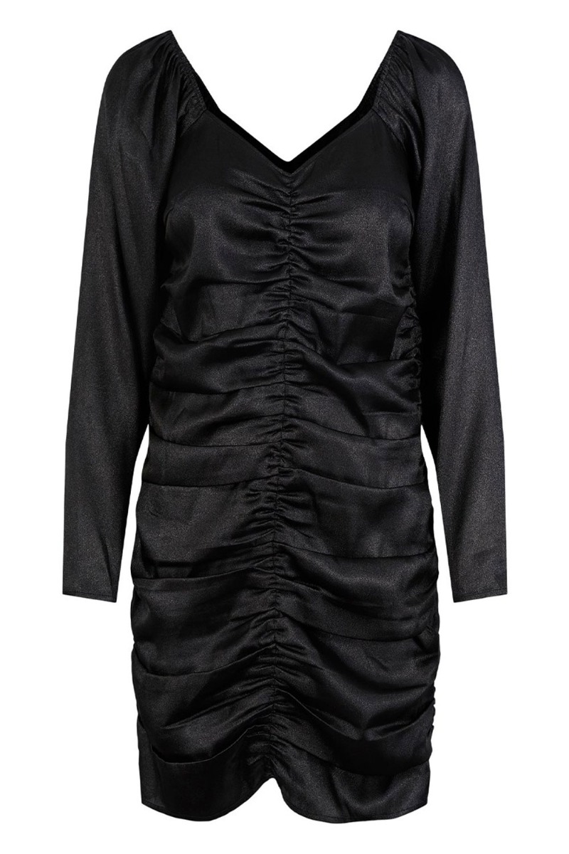 Smukkeste festkjole fra Pieces med shineeffekt i den smukkeste pasform. Kjolen har rynkeeffekt i midten og er tætsiddende der gør den stretchy. De lange ærmer har pufdetalje ved skuldrene og elastik ved håndleddet. Style den med en stilet eller lang støvle.