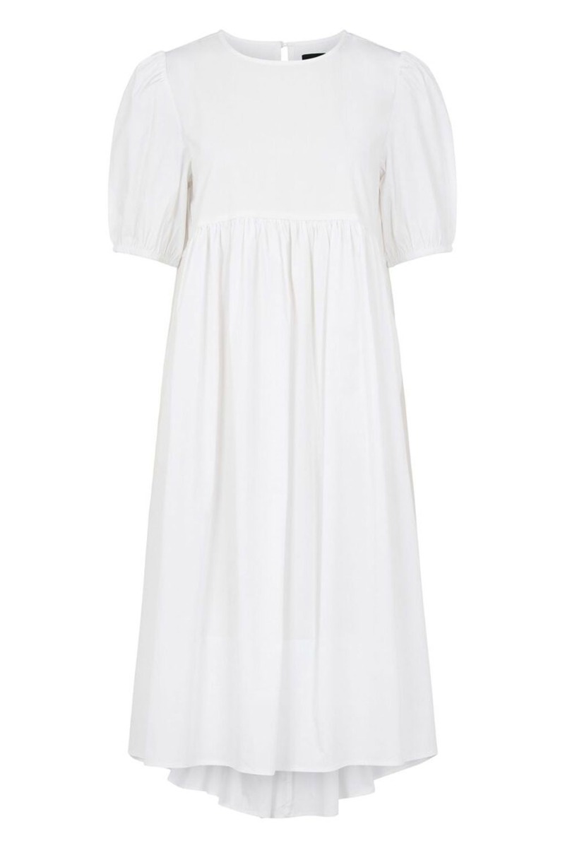 Enkel hvid kjole fra Pieces i et rummeligt ballon-snit. Kjolen er perfekt til dig der bliver student i år og er samtidig den helt perfekte sommerkjole. Den runde halsudskæring lukkes i nakken med knaplukning der giver en lille dråbeformet åbning. Kjolen har korte pufærmer med elastik i kanten. Style den til hverdag med et par sneaks eller sandaler.