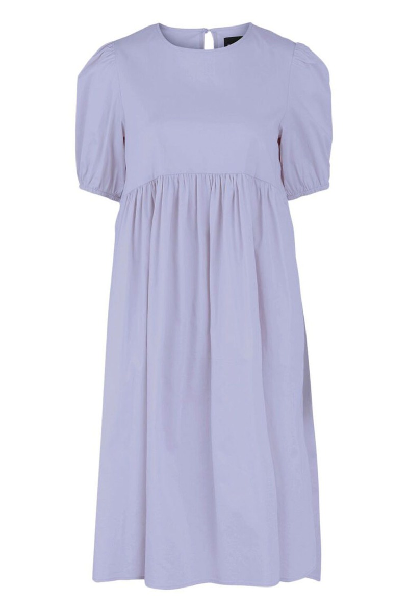 Fineste lilla kjole fra Pieces i et rummelig ballon-snit. Kjolen har en tydelig syning der giver en sød to-delt-effekt. Den lukkes i nakken med en stofbetrukket knap og har de fineste korte ballonærmer. Style den til en sandal eller stiletter alt efter anledning.