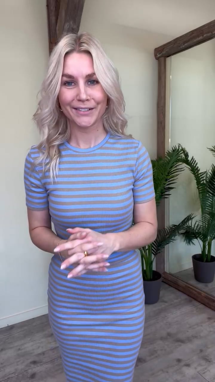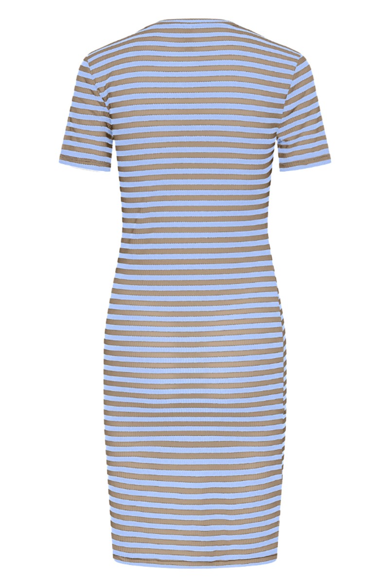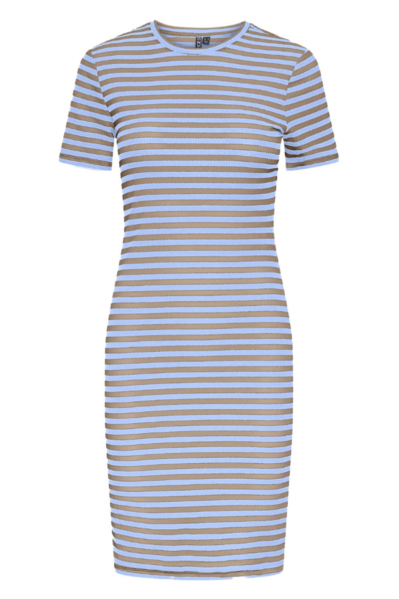 En god kjole der er tætsiddende og i en lækker rib kvalitet fra Pieces. Den er med striber i beige og blå, derfor er den også god som grvaidtetstøj. Den findes i flere farver.