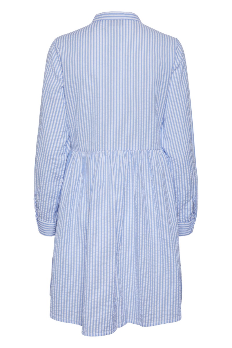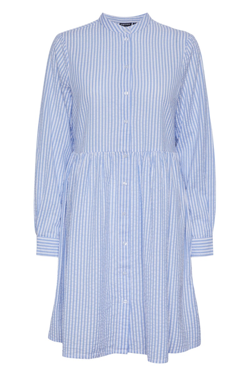 Skøn kjole fra Pieces i den velkendte og meget populære "vaflet" kvalitet. Kjolen er med knapper foran som også gør den ammevenlig. Derudover er der peblum forneden og knaplukning ved ærmerne. Denne kjole model findes også i en beige samt lyserød nuance og er perfekt her til sommer, da det er en let kvalitet.