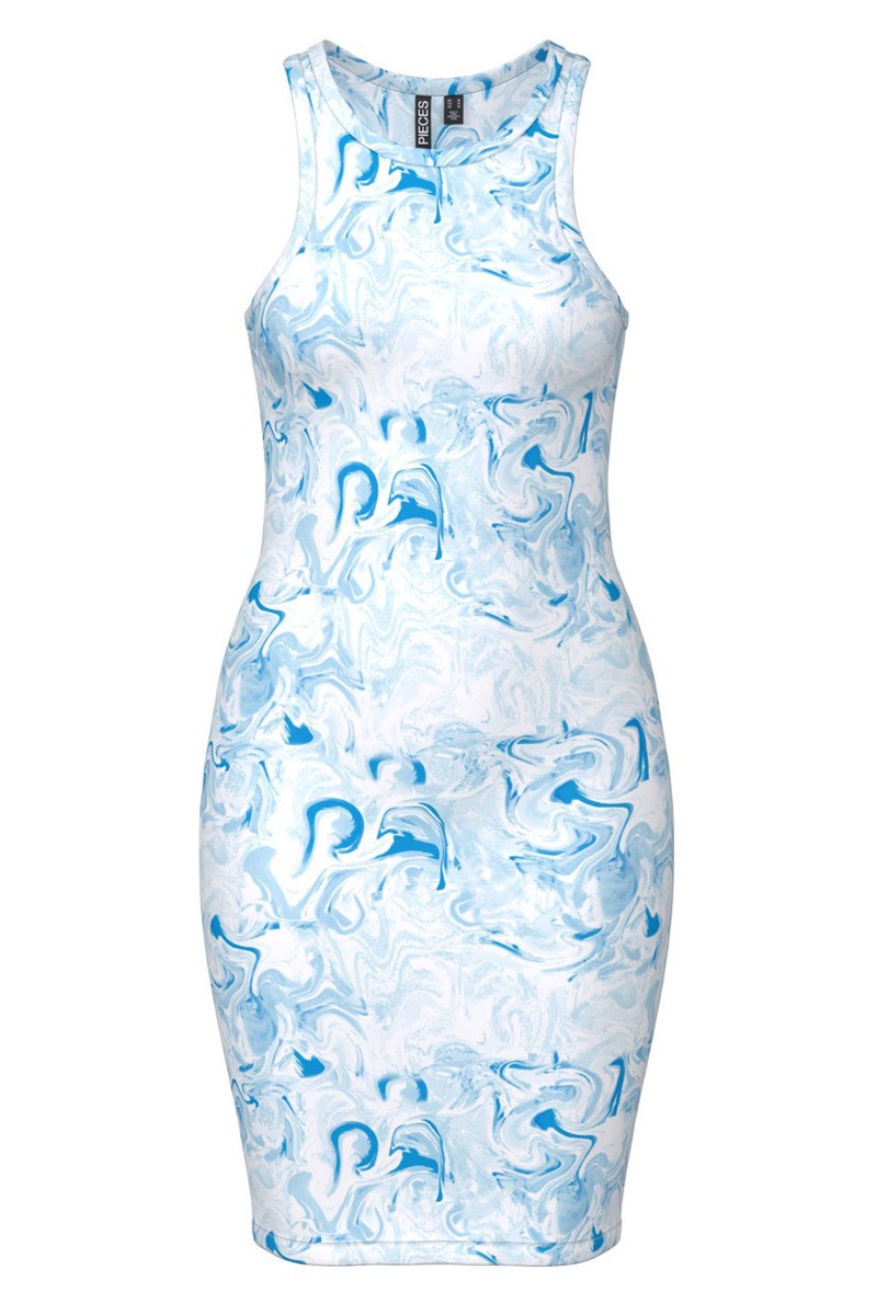 Smuk tie dye kjole fra Pieces i de flotteste blå nuancer. Kjolen er helt tætsiddende med masser af stretch og sidder så flot på. Den er i det lækreste bløde "glatte" materiale der er som smør på kroppen! En kjole der kan bruges både til hverdag med denimjakke og sneaks til og samtidig dresses op til sommerfesten med en stilet og en masse fine smykker.