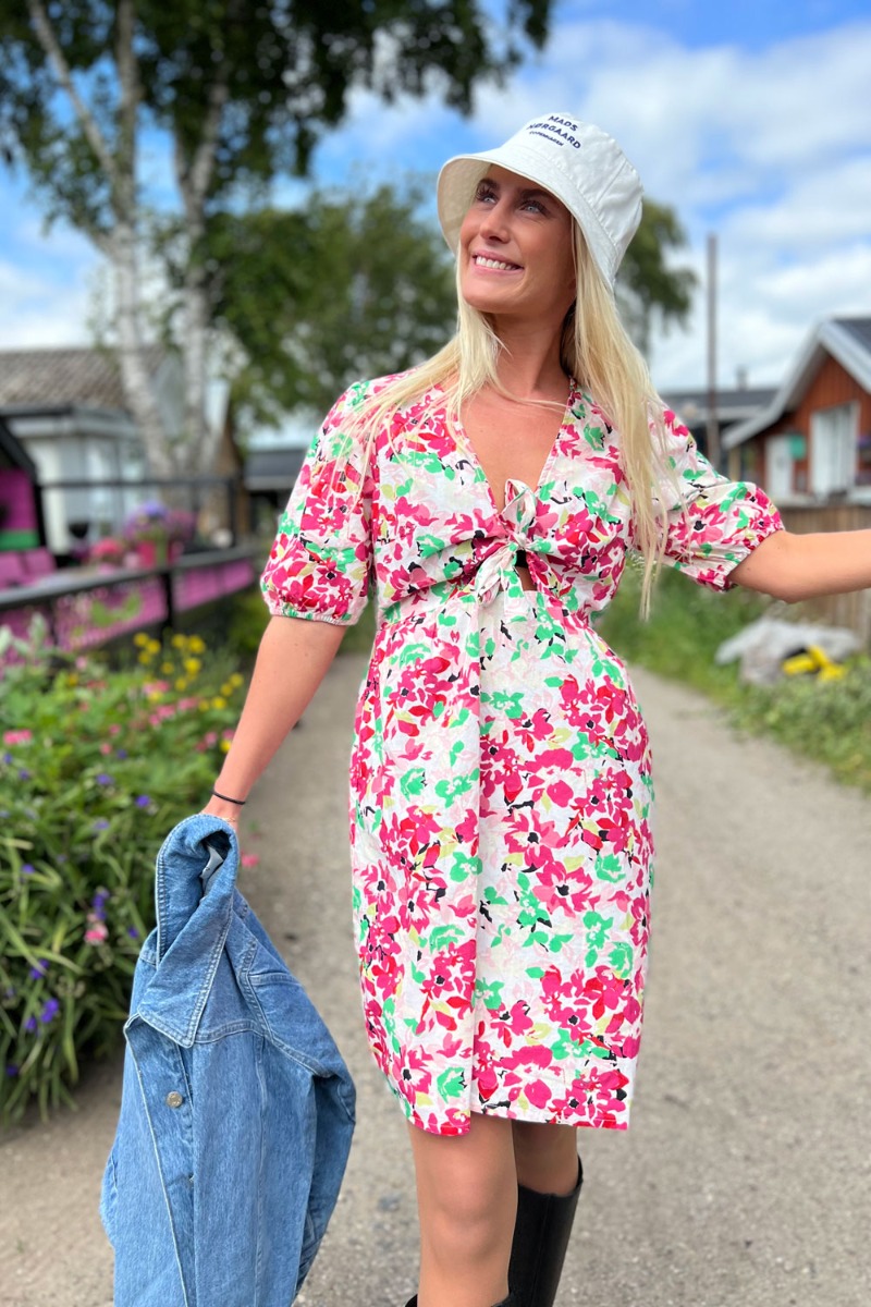 Super smuk sommerkjole fra Pieces. Bundfarven er lys med de fineste farvet blomster i pink, grøn og rosa nuance. Den har en feminin pasform med en tydelig talje i et løst snit. Foran er kjolen designet med en lille åbning der lukkes som en lille sløjfe foran og giver den sødeste effekt. Kjolens korte t-shirtærmer afsluttes med elastikkant og har et lille puf. Style den med en stilet eller sandal alt efter anledning.