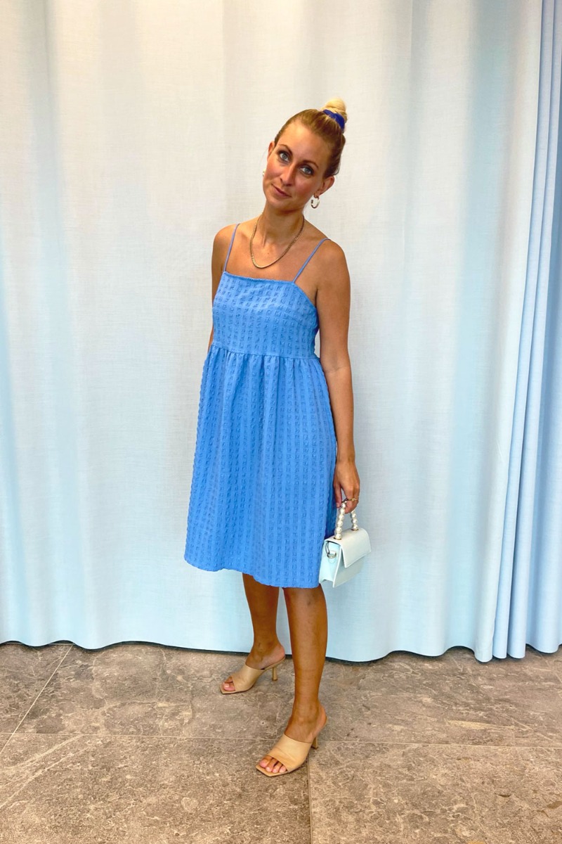 En rigtig sommerkjole fra Pieces er landet med det fineste diskrete strukturmønster. Kjolen har en sød rummelig pasform i et to delt look. Den kan justeres i stropperne og er lavet i en blød kvalitet med masser af stretch.