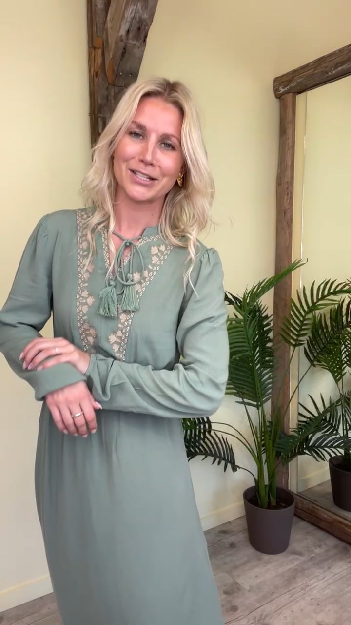 En sød enkel sommerkjole fra Pieces i en flot støvet grøn. Kjolen har struktur i stoffet og i en let kvalitet der falder utrolig flot med en diskret elastikkant i taljen. Den lukkes i halsen med snøre og skaber en lille åbning fortil. Kjolen har et sødt lyst broderet mønster foran og elastik ved håndleddet. Style den til en sommerdag med en sandal eller gør den cool til festival med støvler til.