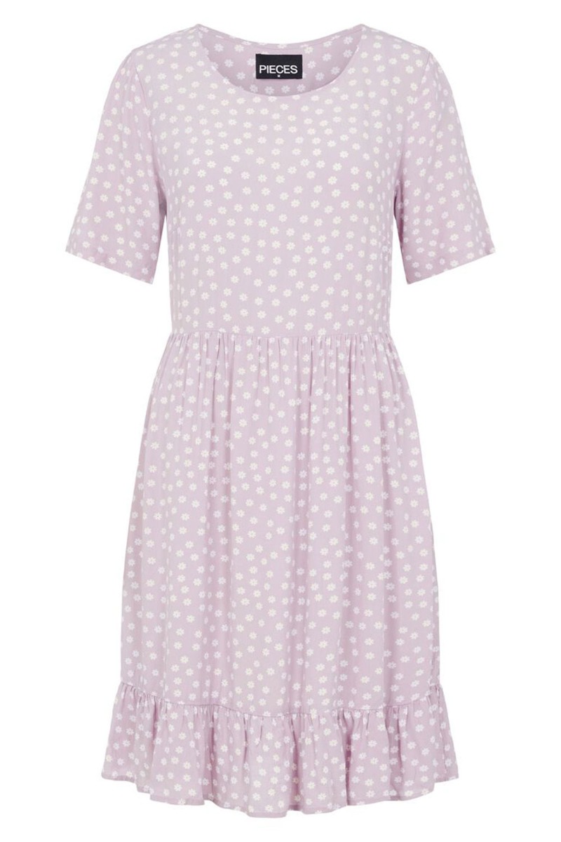 Fin lilla kjole fra Pieces med små hvide blomster. Den er let behagelig med rund hals og korte t-shirtærmer. Kjolen er super skøn til de varme sommerdage og kan styles med sneaks eller sandaler.