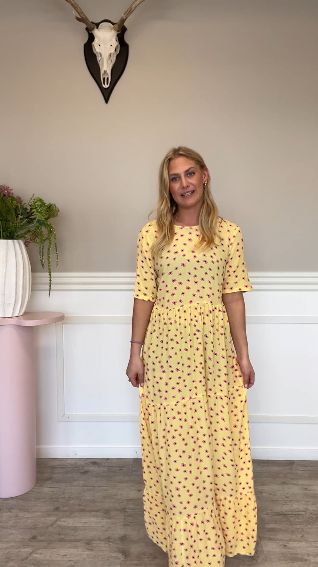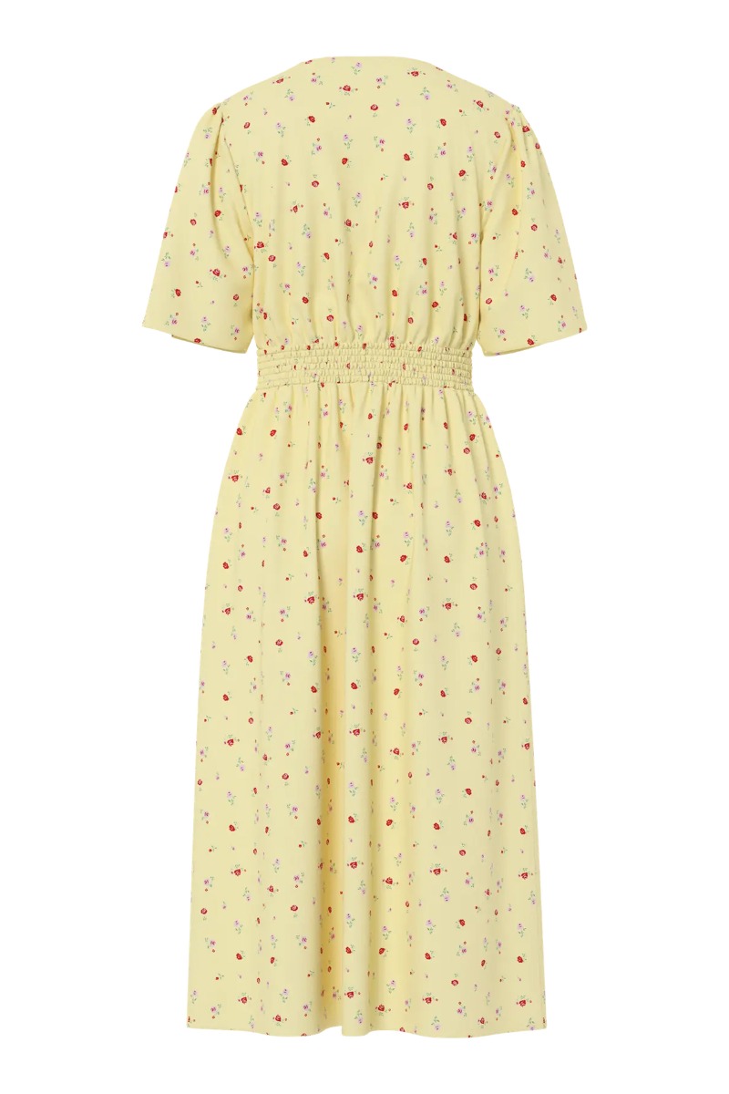 En smuk kjole i en dejlig let kvalitet fra Pieces er landet i denne smukke gule farve. Den er med indsnævring i taljen og derfor sætter den sig flot ved taljen. Den er med korte ærmer og V hals hvilket er med til at udstråle sommer. Den findes også i gul.