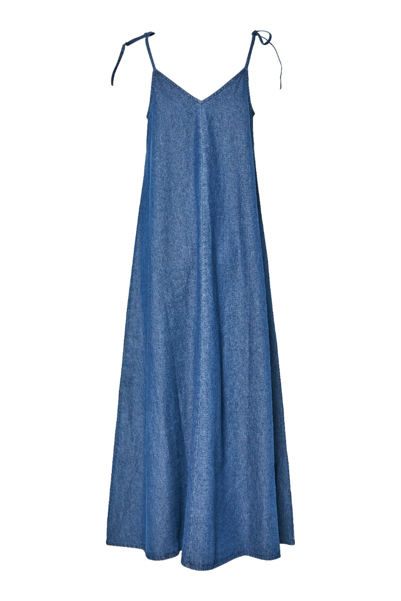Fin kjole fra Pieces i en blå denim farve. Denne kjole er lang og falder løsere omkring anklerne. Skulderstropperne bindes som et lille bindebånd. Brug den til et par sandaler eller style den med en hvid t-shirt eller bluse under til de lidt koldere dage!
