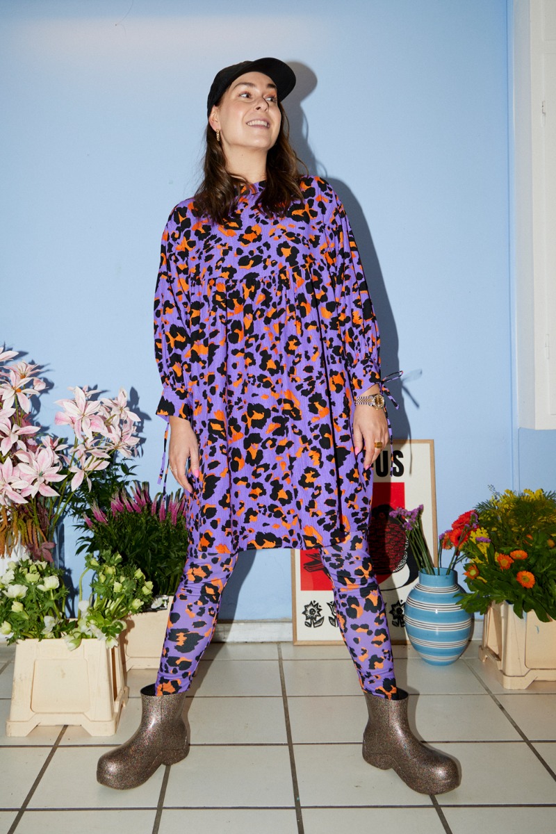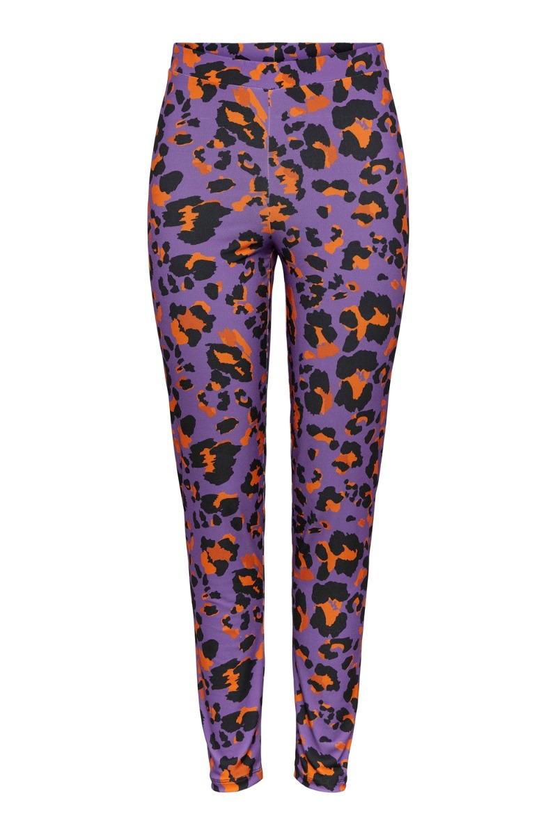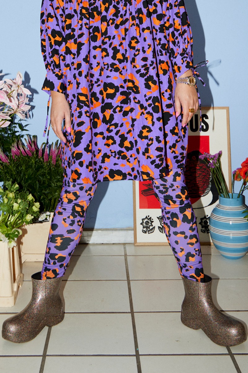 Disse leggings er lilla i bunden og med grafiske leopard pletter i sort og orange. De er i et sporty materiale med stræk og har en glat overflade. Der er plads i benene og er du mellem to str skal du tage den mindste eller gå en str ned.