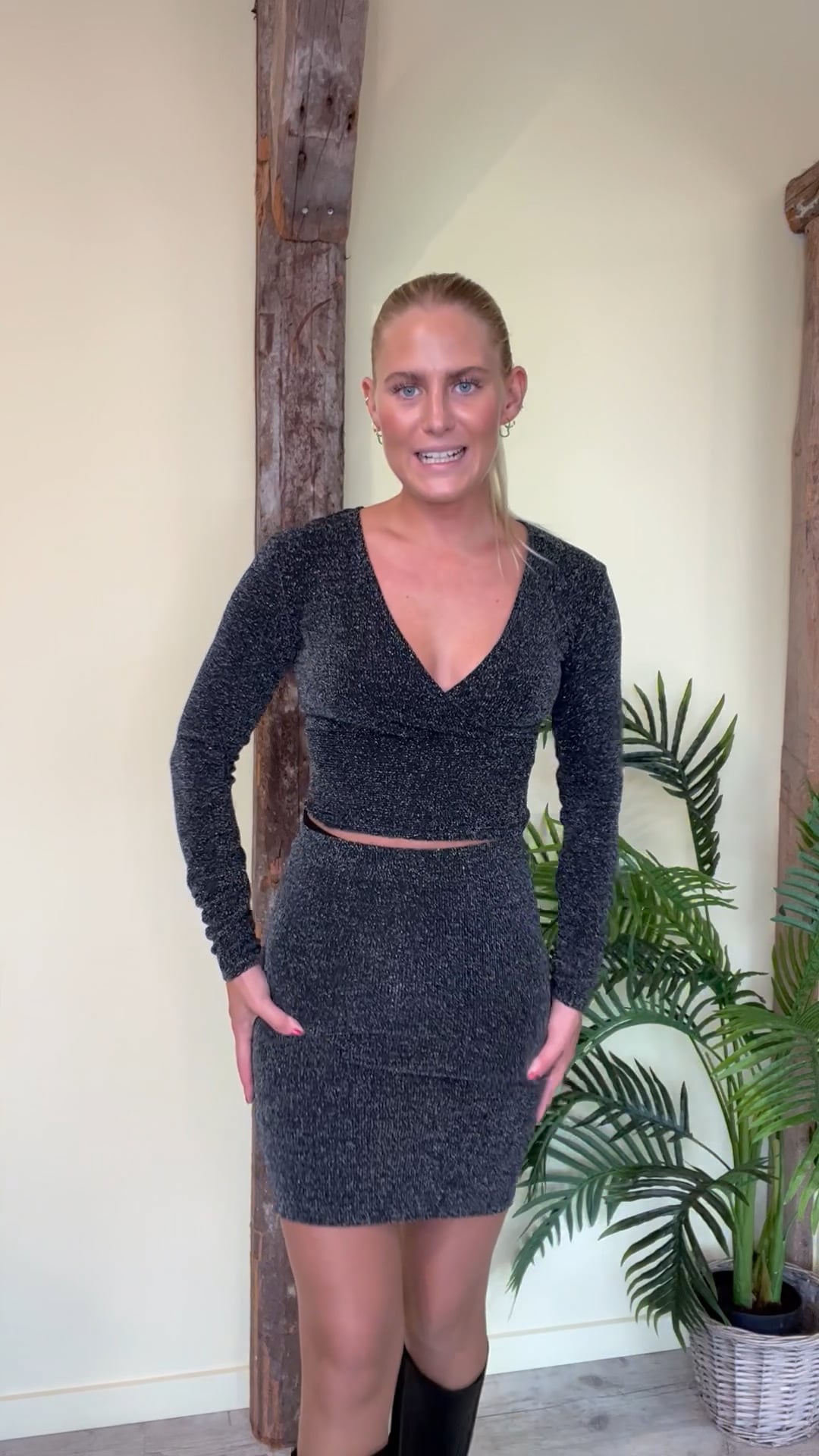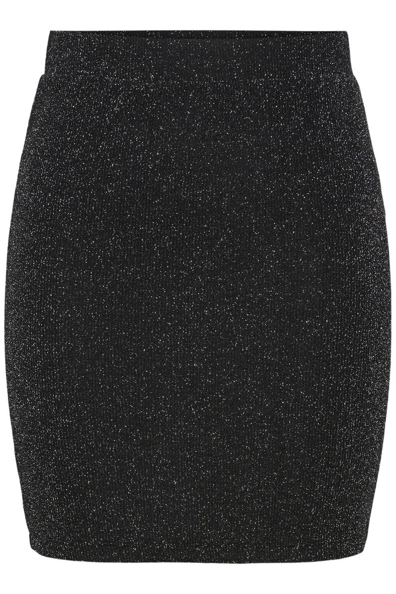 En fin nederdel fra Pieces er landet i en dejlig blød stræk kvalitet. Nederdelen er sort med glimmer tråd vævet ind i stoffet. Der er elastik i taljen og der findes en matchende top til. Den er tætsiddende også derfor også med masser af stræk.