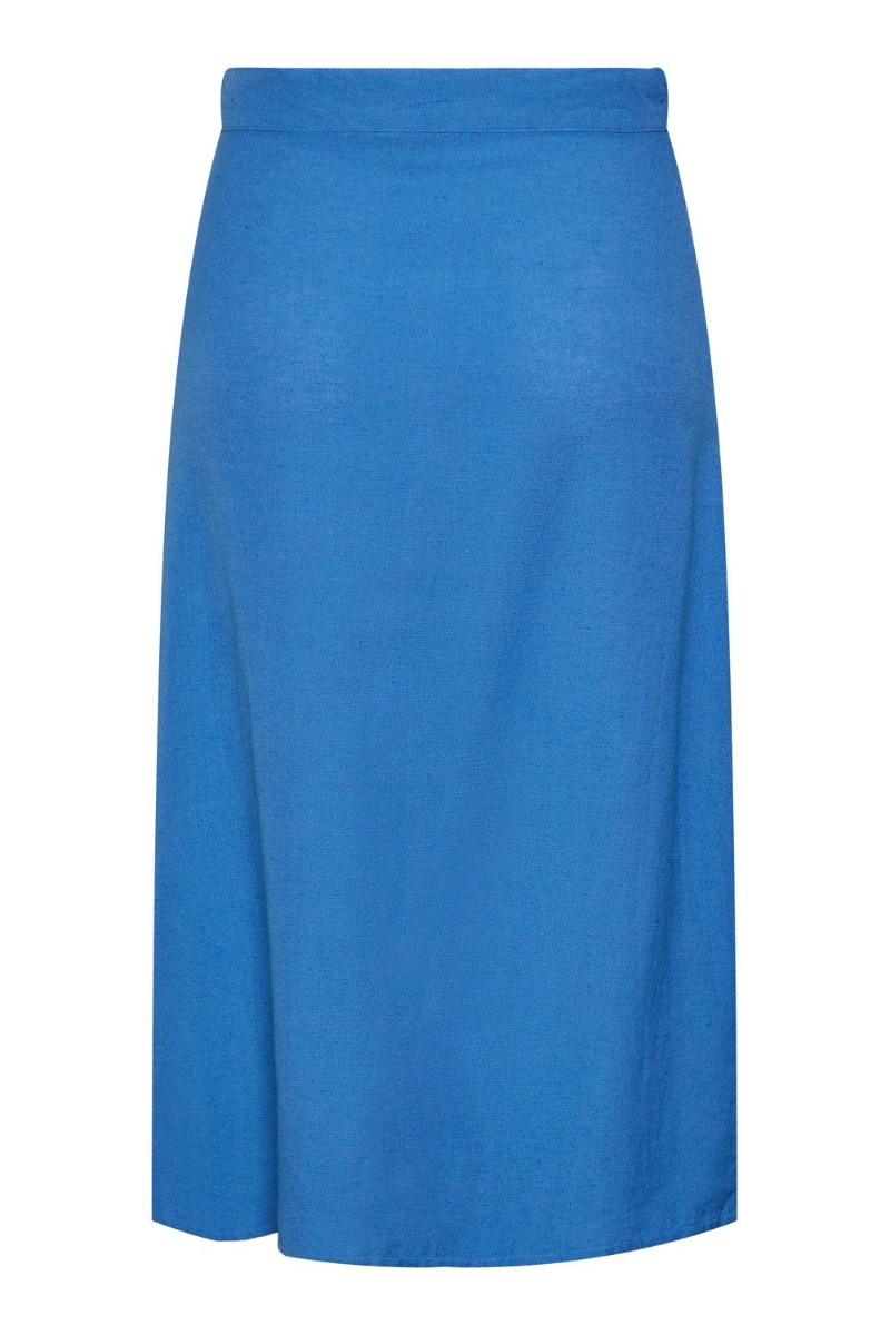 En fin nederdel i en skøn hør kvalitet fra Pieces. Nederdelen er blå og med en draperings detalje foran i den ene side. Nederdelen har vide i bunden og elastik i taljen - dog kun bagpå så den stadig har den fine glatte overflade foran. Den findes også i flere farver.